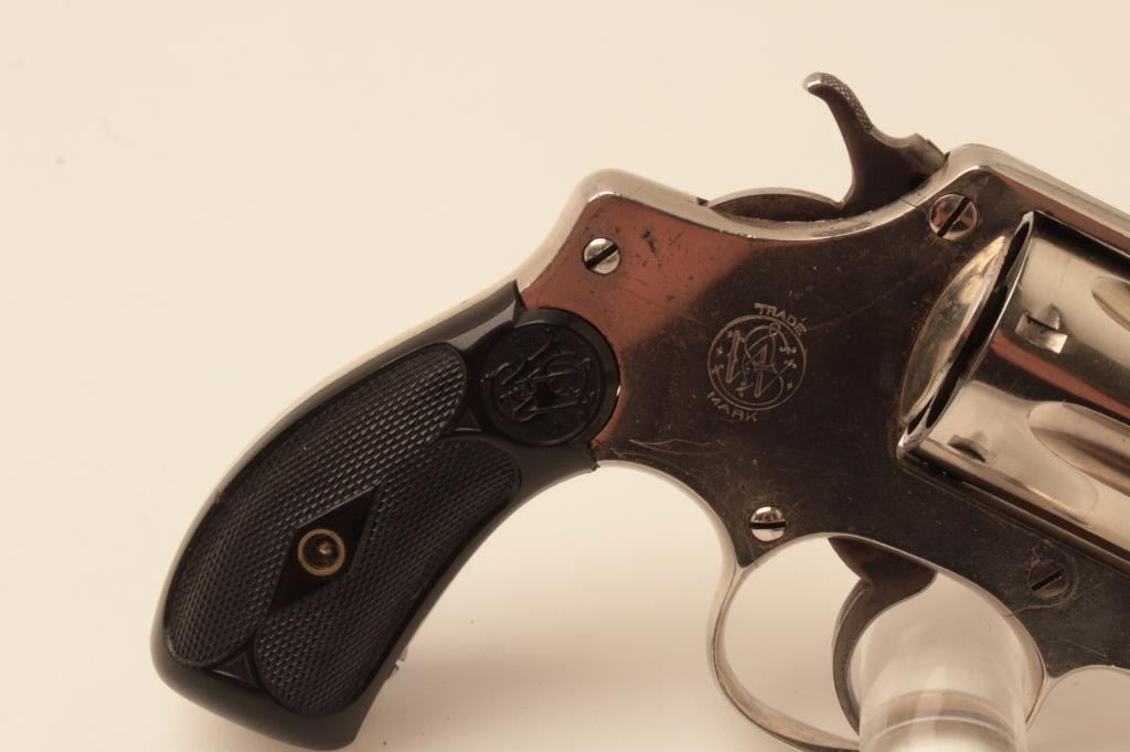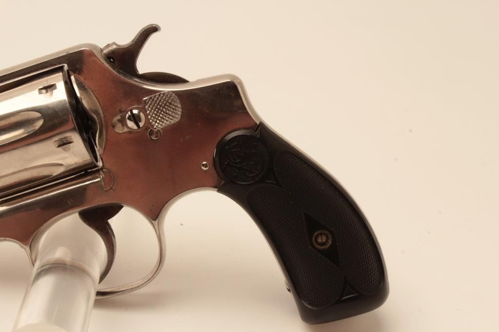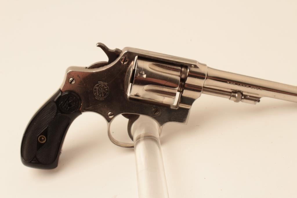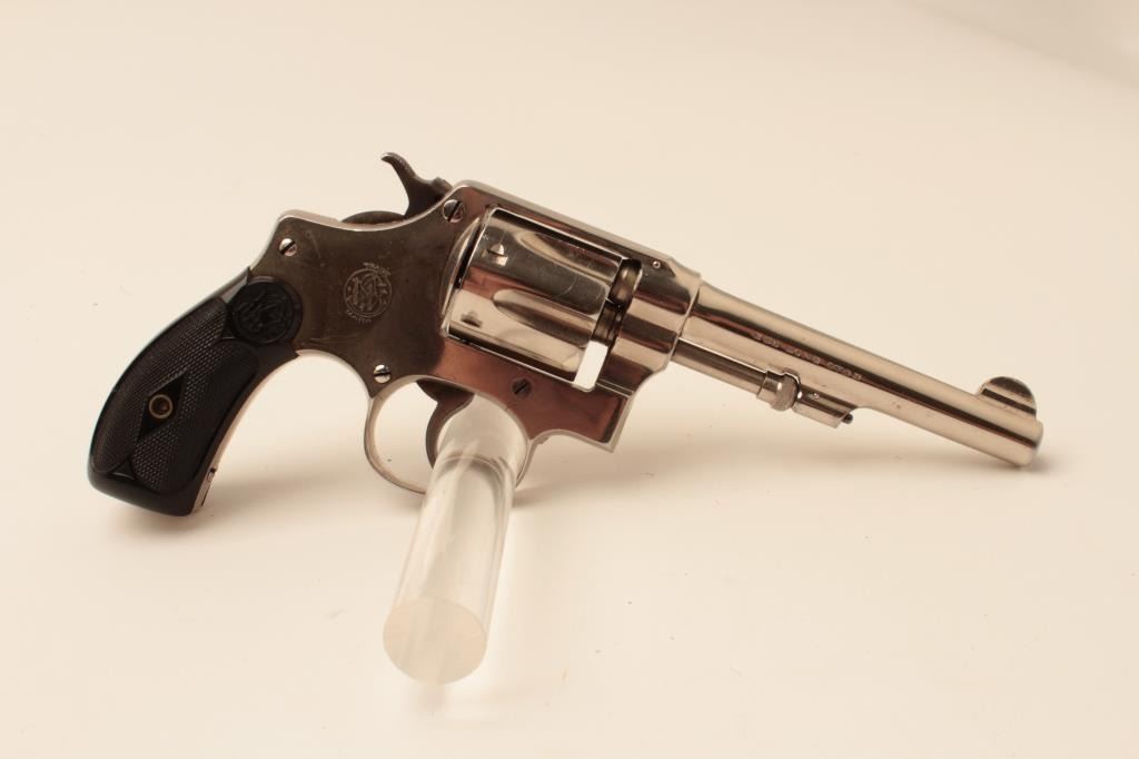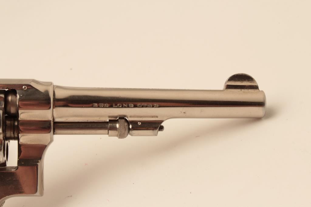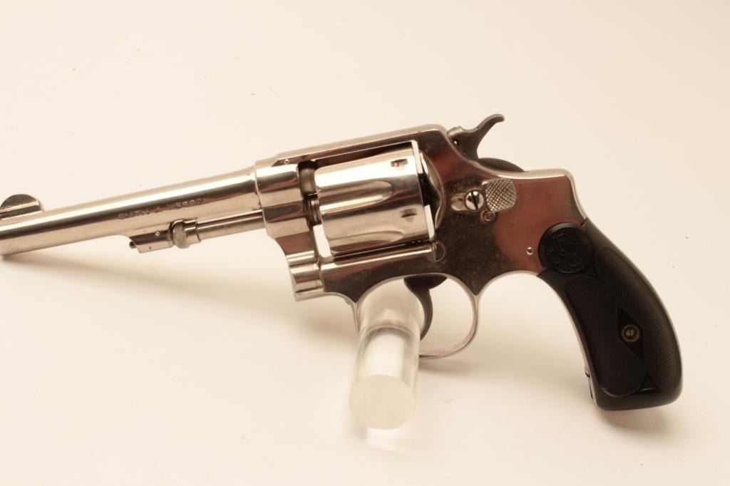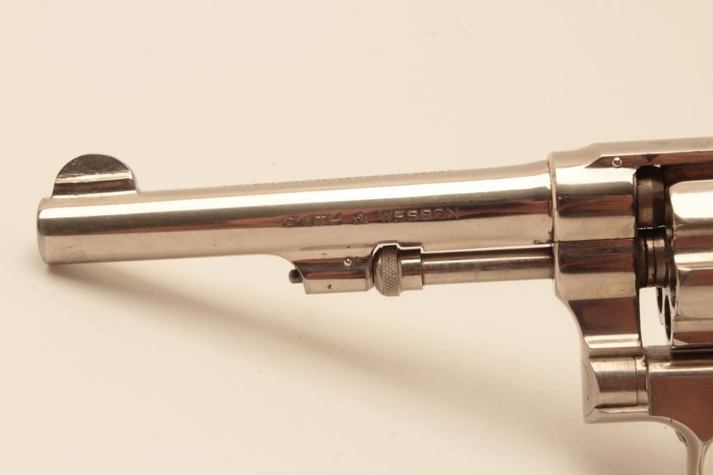 Smith & Wesson Hand Ejector DA revolver, 5 screw, .32 Long caliber, 4.25” barrel, nickel finish, checkered hard rubber grips, S/N 251116; overall very good to fine condition displaying majority of original finish, verygood bore, very good action, sharp markings and fine grips. (C&R). Est.: $250-$500.