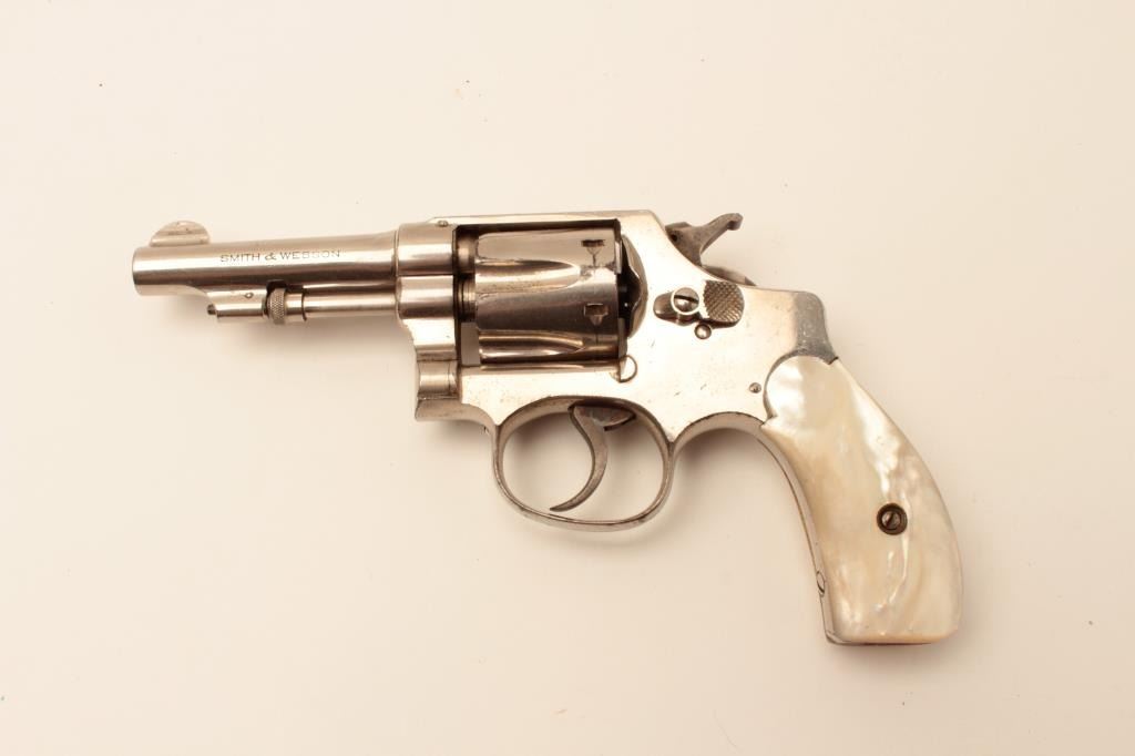 Smith & Wesson Hand Ejector DA revolver, 5 screw, .32 Long caliber, 3.25” barrel, nickel finish, pearl grips, S/N 272742; overall fine condition showing majority of original nickel finish, fine bore, action, markingsand iridescent pearl grips. (C&R). Est.: $350-$700.