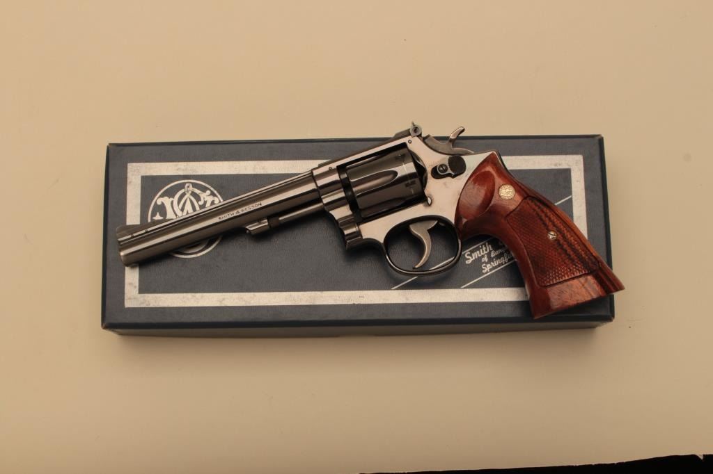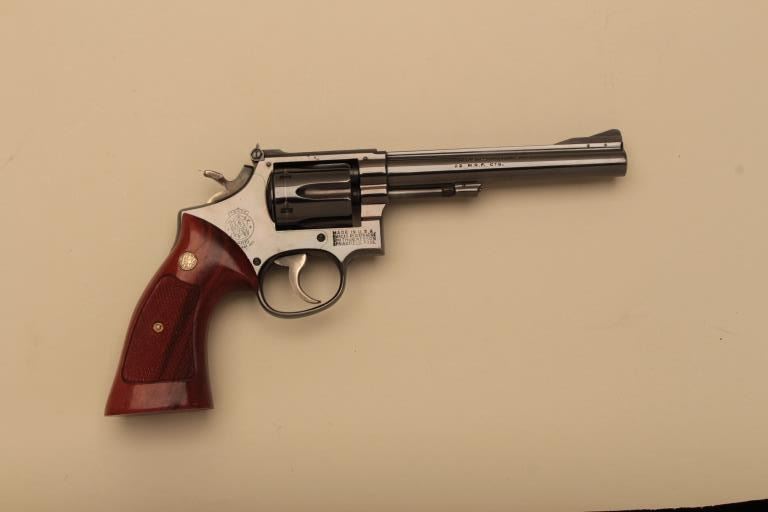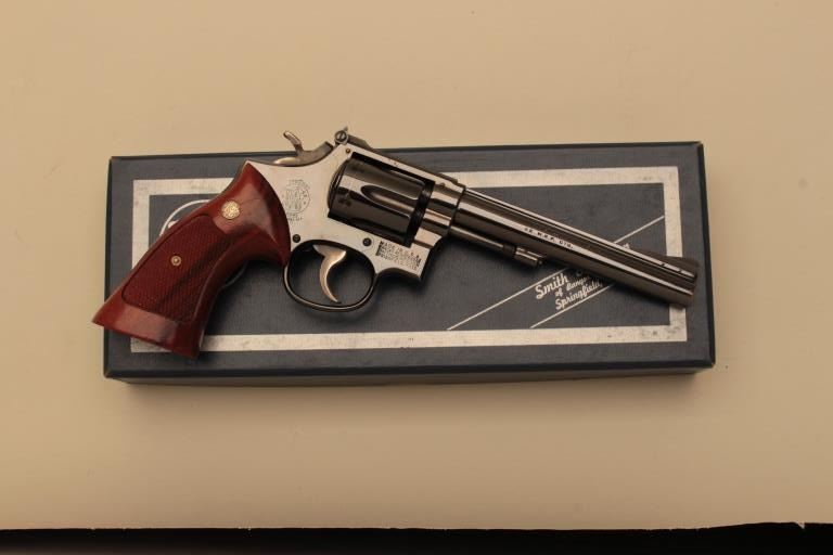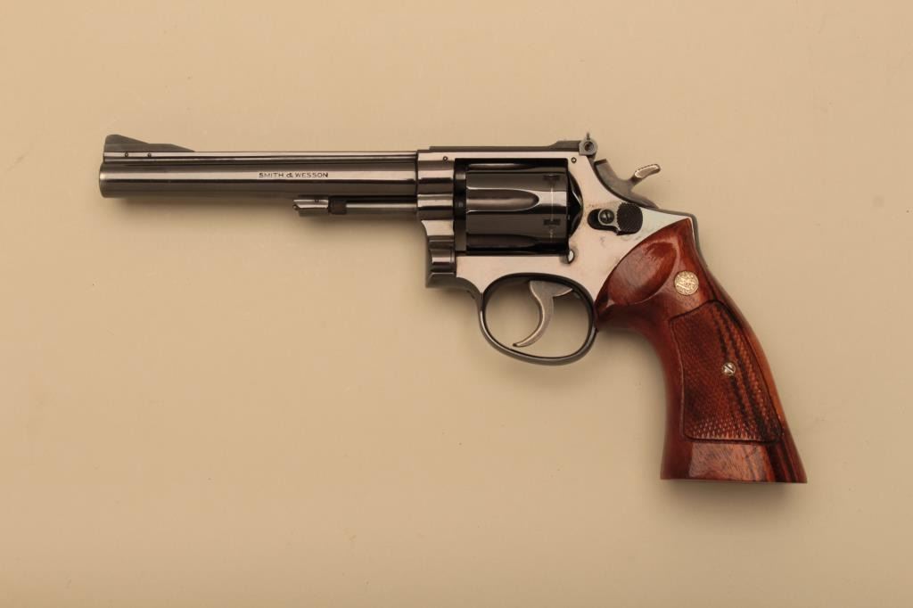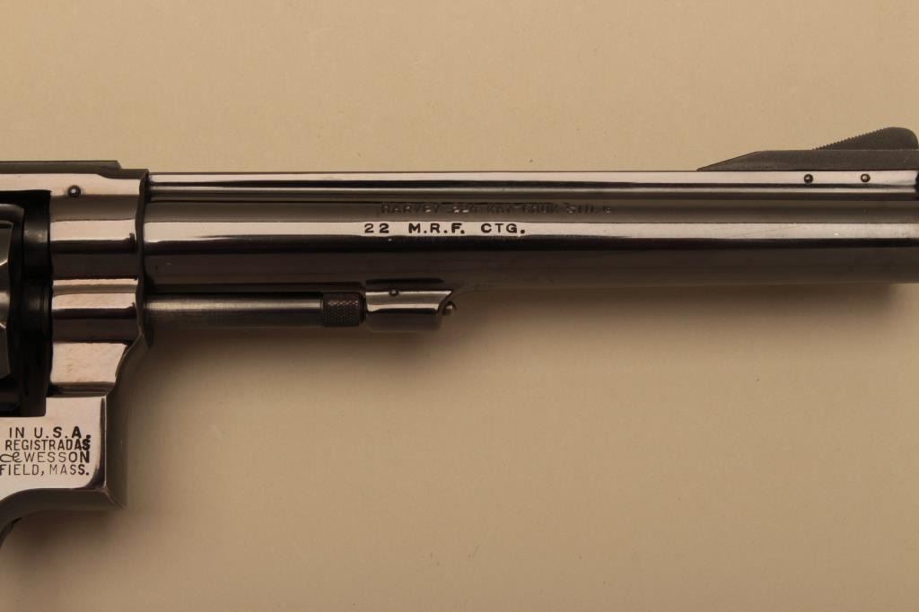 Smith & Wesson Model 48 (no dash) DA revolver, .22 M.R.F. caliber, 6” barrel marked “Harvey .224 Kay-Chuk Std” over caliber marking on right side of barrel, blued finish, checkered wood medallion combat grips, S/N K388014; overall excellent condition showing slight muzzle wear; excellent bore, action, markings and grips; in factory two piece cardboard box. (C&R). Est.: $600-$1,200.