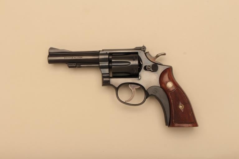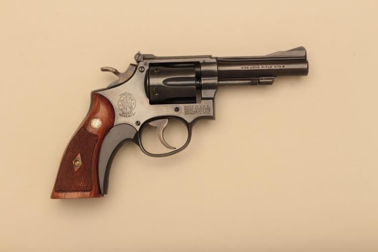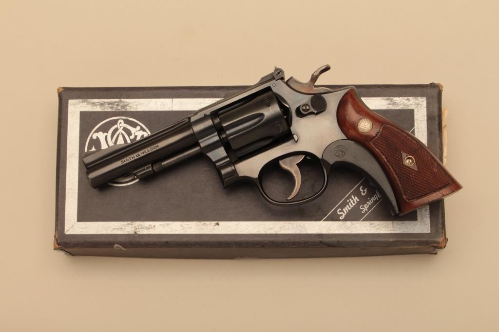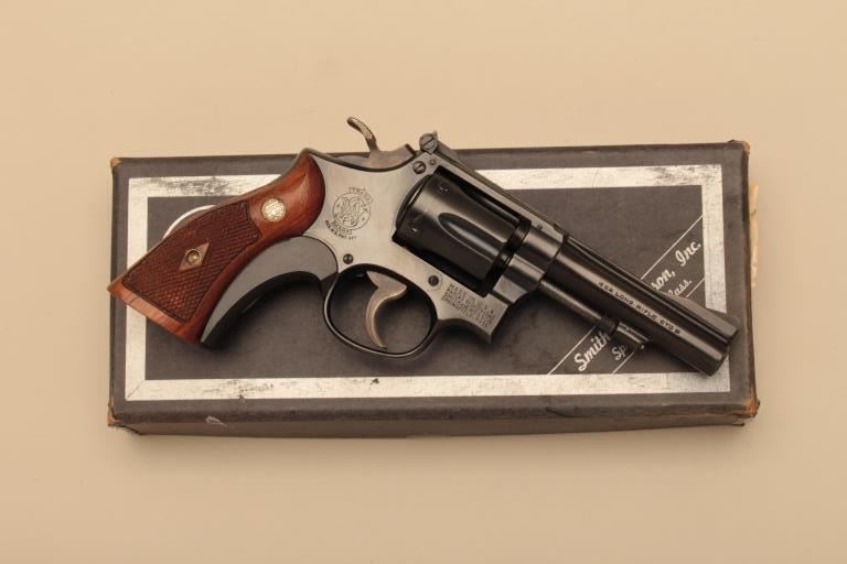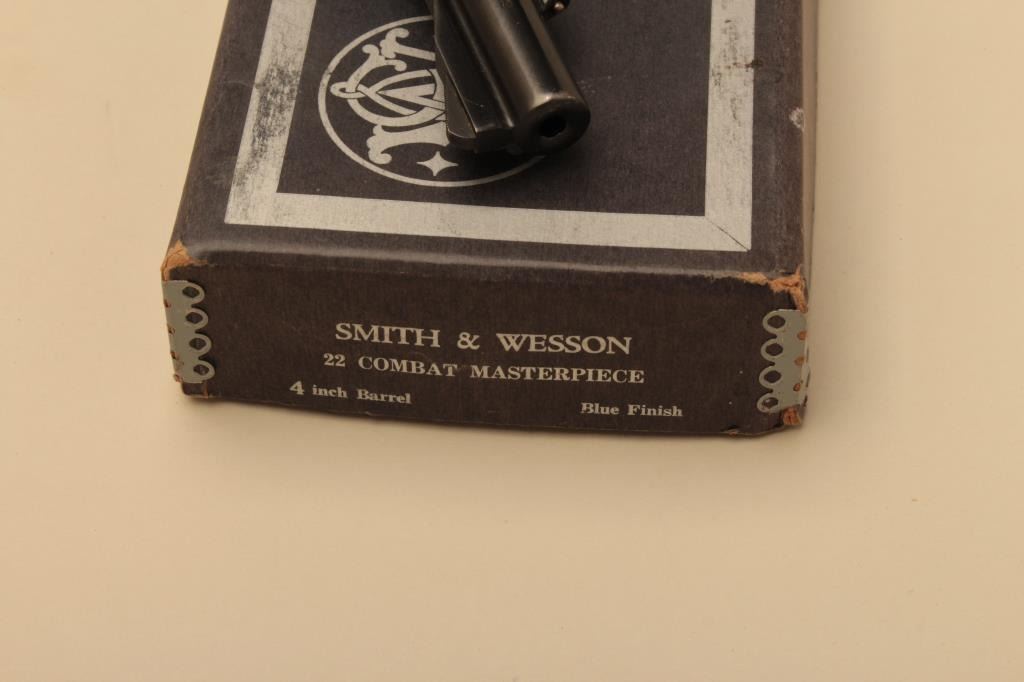 Smith & Wesson Pre-Model 18 Combat Masterpiece DA revolver, .22LR caliber, 4” barrel, blued finish, target hammer, checkered wood medallion grips with S&W grip shoe, 5 screw frame, S/N K 228921; overallnear new condition with factory two piece blue and silver cardboard box and correct style end label. (C&R). Est.: $500-$1,000.