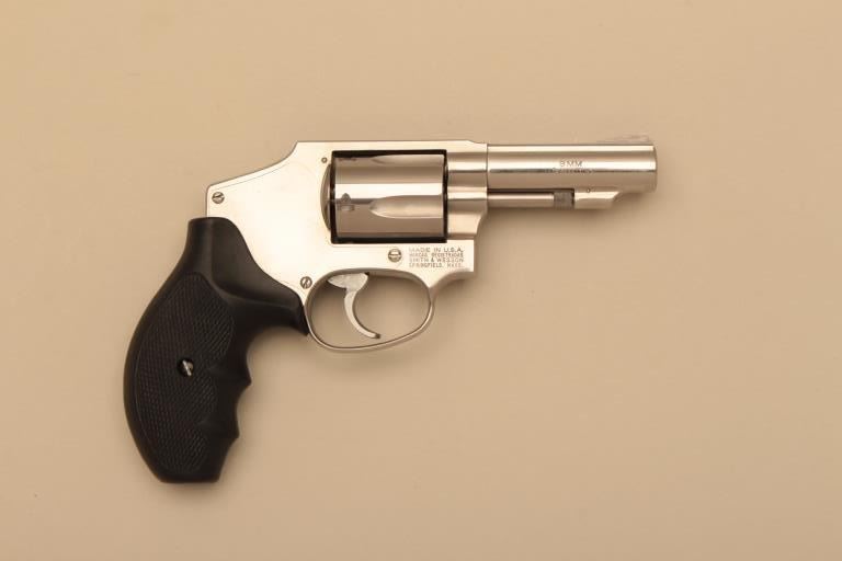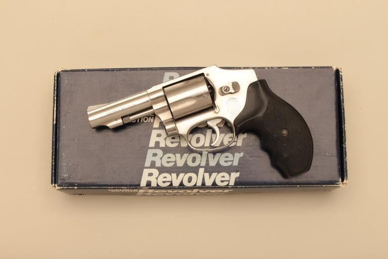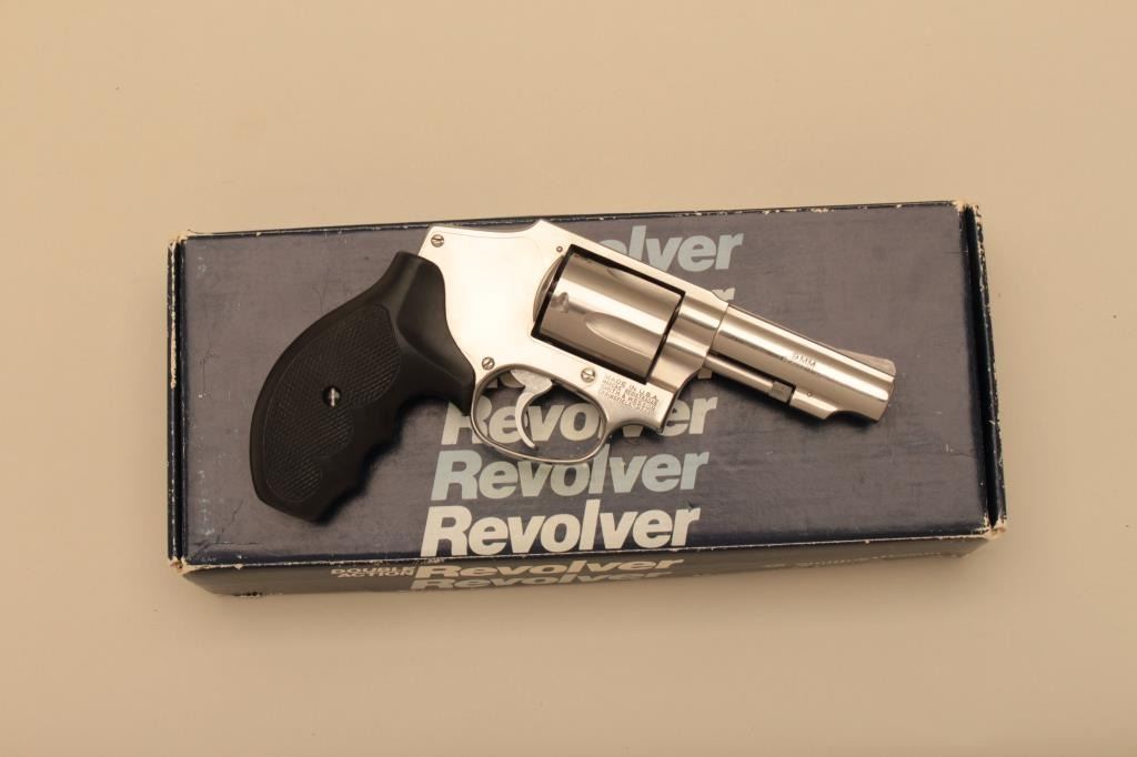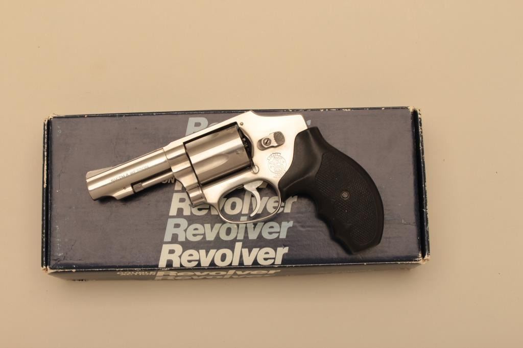Rare Smith & Wesson Model 940 Centennial Model DA revolver, 9mm parabellum caliber, 3” barrel, stainless, checkered finger groove hard rubber grips, S/N BKE3206; overall fine condition showing minimal use; accompanied by a blued factory cardboard box and 6 star clips. (Modern/NO CAL. SALE). Est.: $600-$1,200.