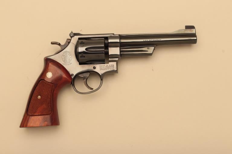 Smith & Wesson Model 27-2 DA revolver, .357 Magnum caliber, 6” barrel, blued finish, checkered wood medallion combat grips, S/N N325332; overall like new with factory two piece cardboard box. (Modern/NO CAL.SALE). Est.: $600-$1,200.