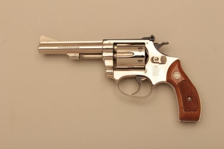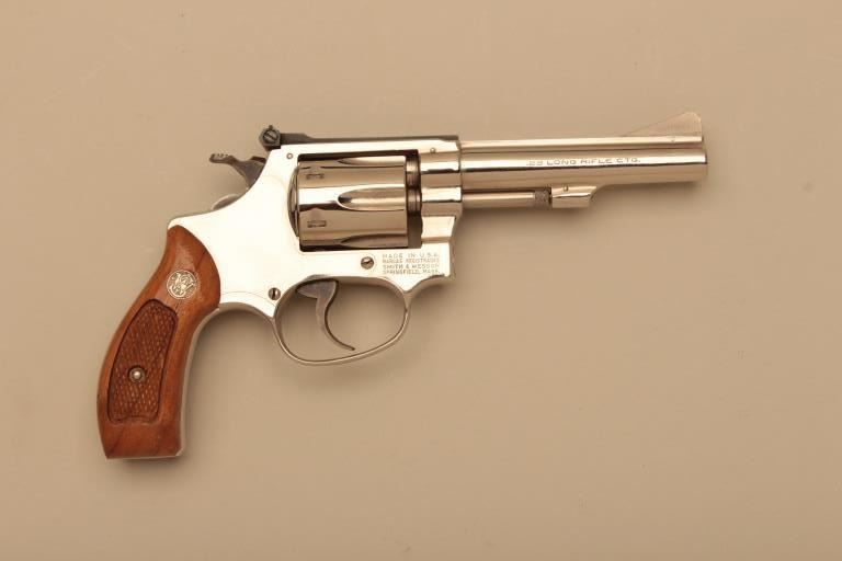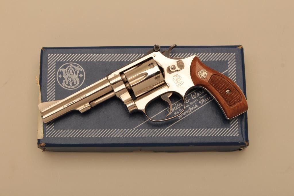 Smith & Wesson Model 34-1 Kit Gun (.22/32) DA revolver, .22LR caliber, 4” barrel, nickel finish, checkered wood medallion grips, S/N M181433; overall like new condition with factory two piece cardboard box, end labelnumbered to this gun and cleaning kit. (Modern/NO CAL. SALE). Est.: $500-$1,000.