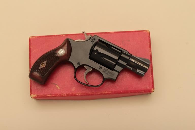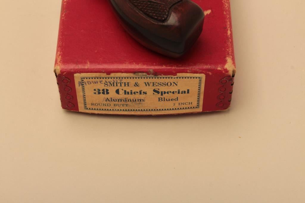 Smith & Wesson Chiefs Special Airweight (aluminum) DA revolver, 2” barrel, flat latch, .38 Special caliber, blued finish, checkered wood medallion grips, S/N 28442, in overall excellent condition displayinglittle use or handling; accompanied by factory two-piece red cardboard box with correct end label. (C&R). Est.: $600-$1,200.