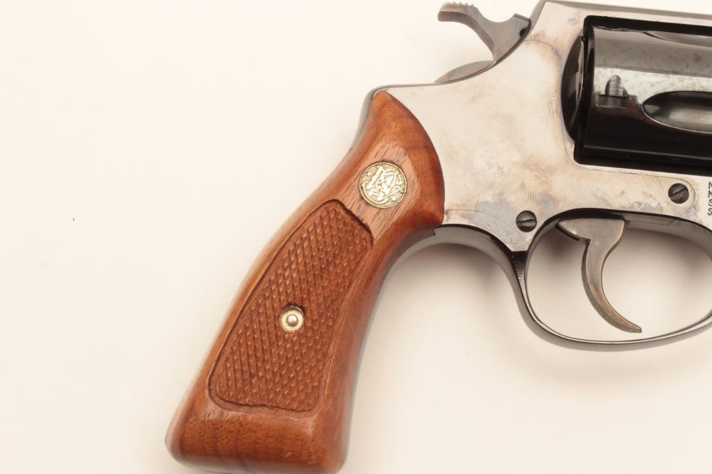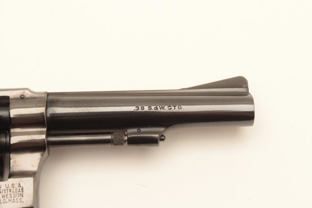 Smith & Wesson Model 33-1 DA revolver, .38 S&W caliber, 4” barrel, blued finish, checkered wood medallion grips, S/N R42038; like new condition in factory two piece cardboard box, instructions and with end label numbered to this gun. (C&R/NO PPT). Est.: $350-$700.