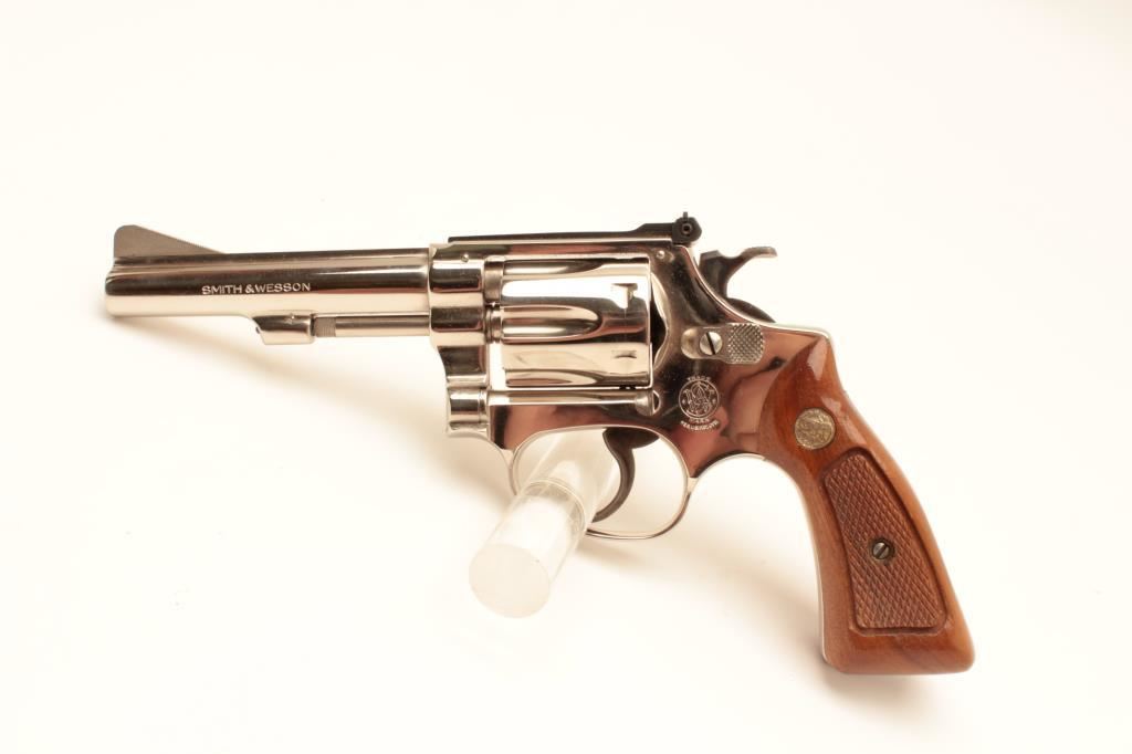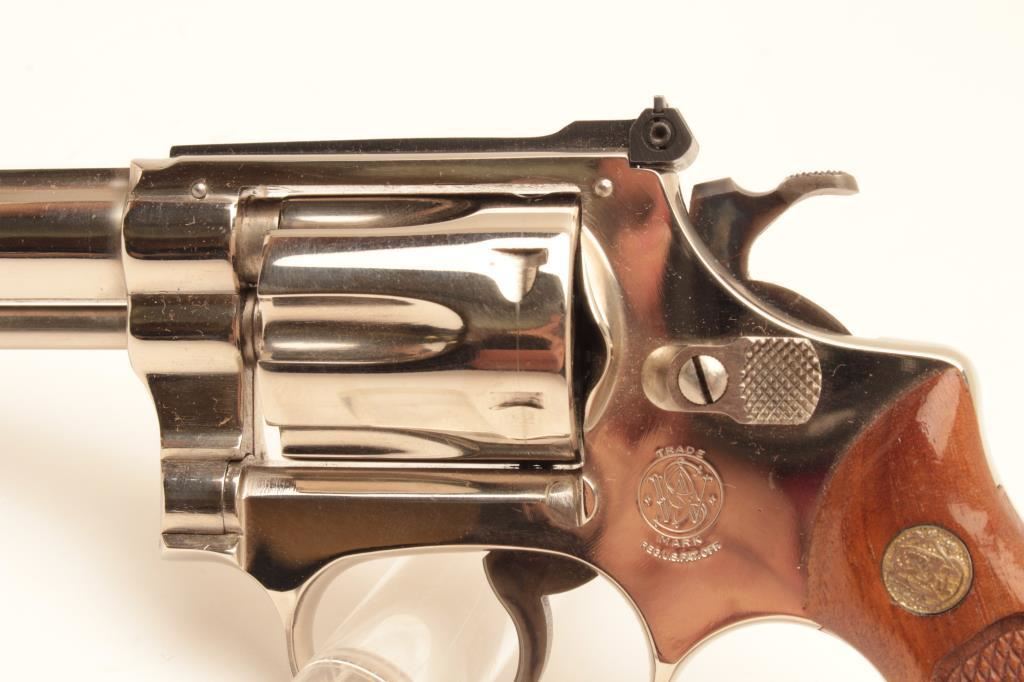 Smith & Wesson Model 34-1 DA revolver, .22LR caliber, 4” barrel, nickel finish, checkered wood medallion grips, S/N M131841; overall like new condition with factory two piece silver and blue cardboard box, instructions, cleaning tool and detached end label numbered to this gun. (Modern/NO CAL. SALE). Est.: $500-$1,000.