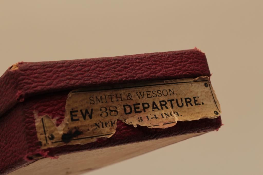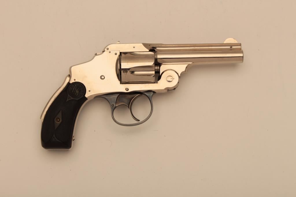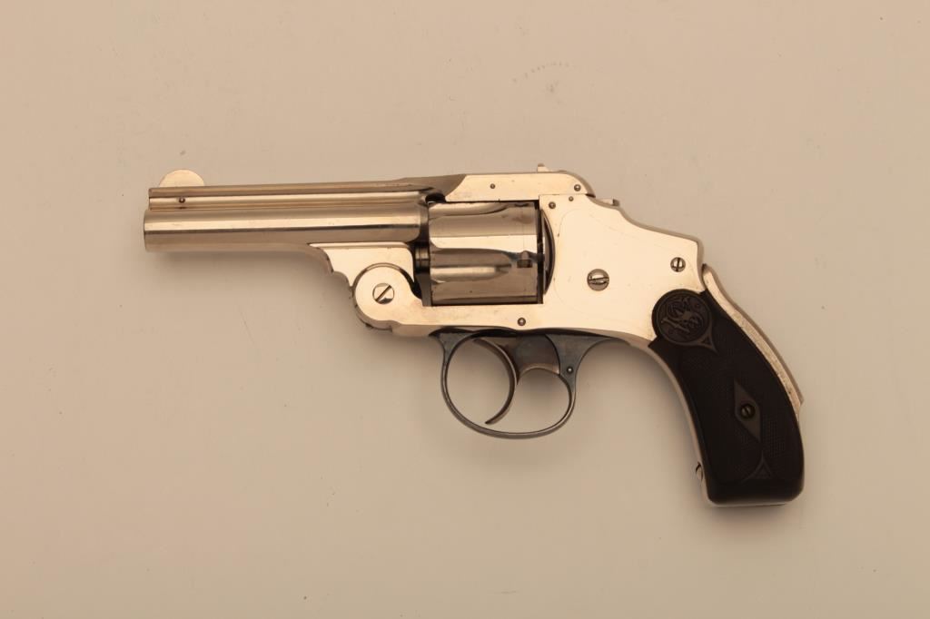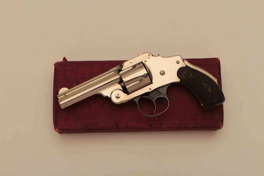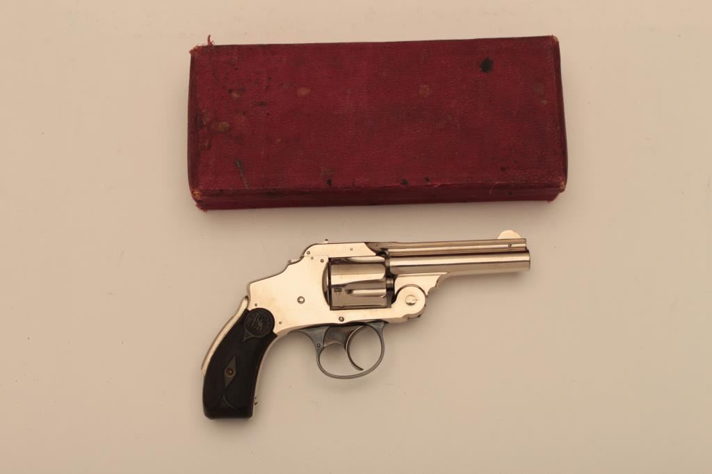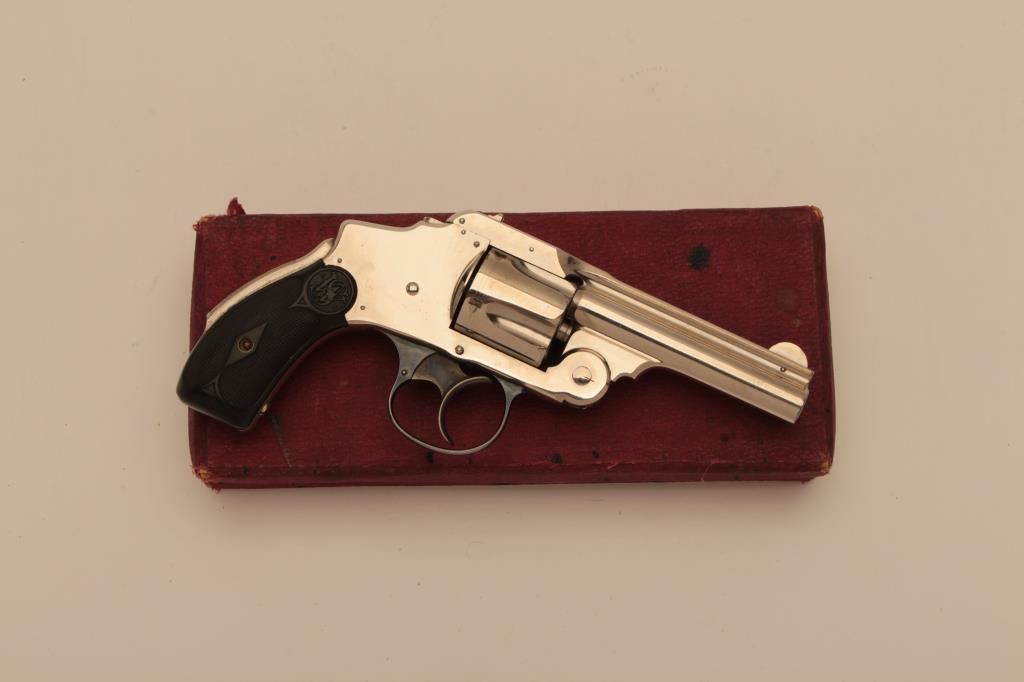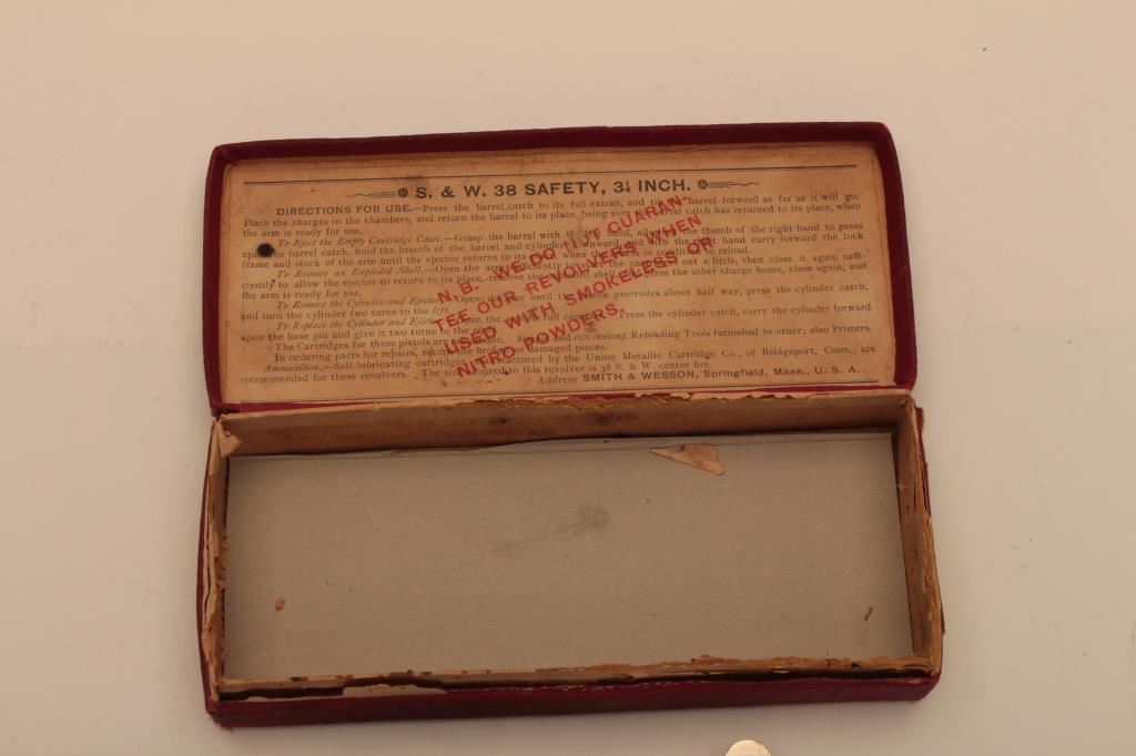 Smith & Wesson New Departure DA revolver, .38 caliber, 3.25” barrel, nickel finish, checkered hard rubber grips, S/N 19656; near new condition with factory red fabric covered cardboard box with correct end label showing some losses. (Antique). Est.: $300-$600.