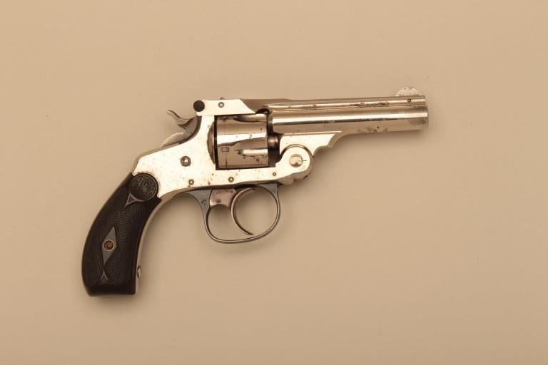 Smith & Wesson top break DA revolver, .32 caliber, 3” barrel, nickel finish, checkered hard rubber grips, S/N 45141; overall fine condition with majority of original finish remaining, fine bore, action, markings andgrips; accompanied by a factory fabric covered cardboard box with correct end label and instructions printed inside the lid. (Antique). Est.: $300-$600.