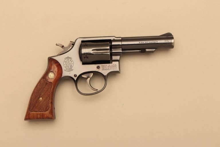 Smith & Wesson Model 10-6 DA revolver, .257 Magnum caliber, 4” heavy barrel, blued finish, checkered wood medallion grips, S/N D559682; fine overall condition with some muzzle and high point wear, fine bore, crispaction, sharp markings and fine grips; accompanied by a two piece factory cardboard box with end label numbered to this gun (Modern/NO CAL. SALE). Est.: $300-$600.