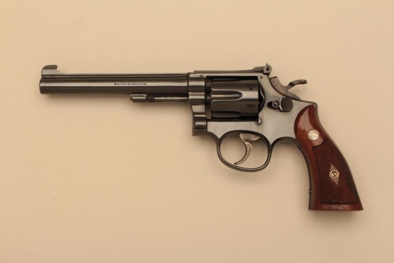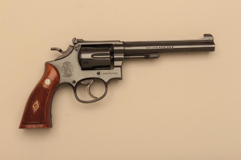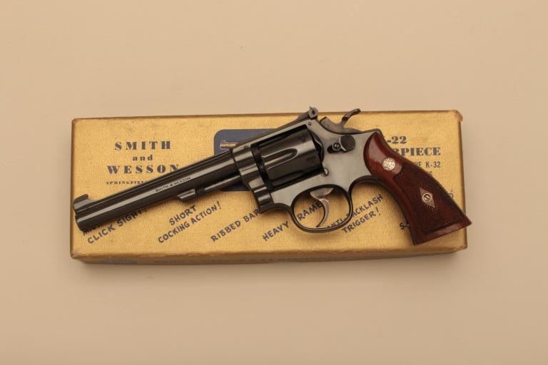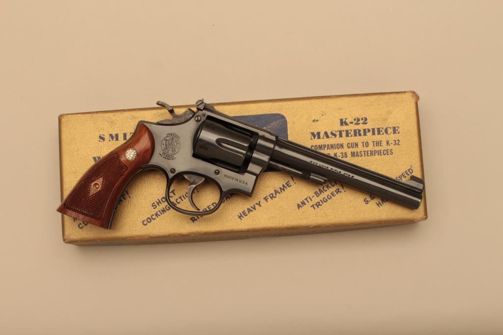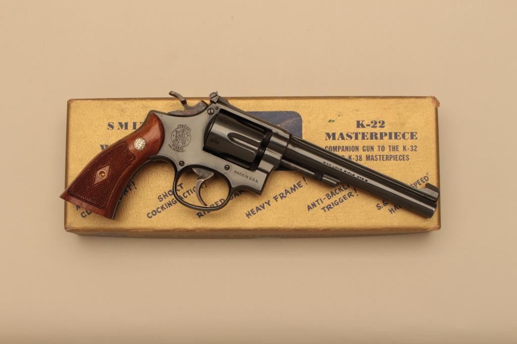 Smith & Wesson pre-Model 17 5 screw K-22 Masterpiece DA revolver, .22LR caliber, 6” barrel, blued finish, checkered wood medallion grips, S/N K 13999; overall near new showing very minor muzzle wear, targethammer and trigger, accompanied by a factory two piece gold and blue cardboard box with correct end panel description of this gun. (C&R). Est.: $700-$1,400.