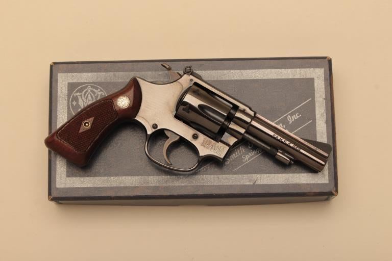 Smith & Wesson Model 51 (no dash) DA .22/32 Kit Gun revolver, .22 M.R.F. caliber, 3.5” barrel, blued finish, checkered wood medallion grips, flat latch, S/N 79647; like new condition with factory two piececardboard box and end label numbered to this gun. (C&R). Est.: $400-$800.