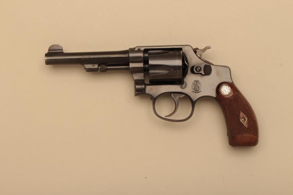 Smith & Wesson pre-Model 33 Regulation Police DA revolver, .38 S&W caliber, 4” barrel, blued finish, checkered wood medallion grips, S/N 58510; overall near new condition with slight muzzle wear. (C&R). Est.:$400-$800.