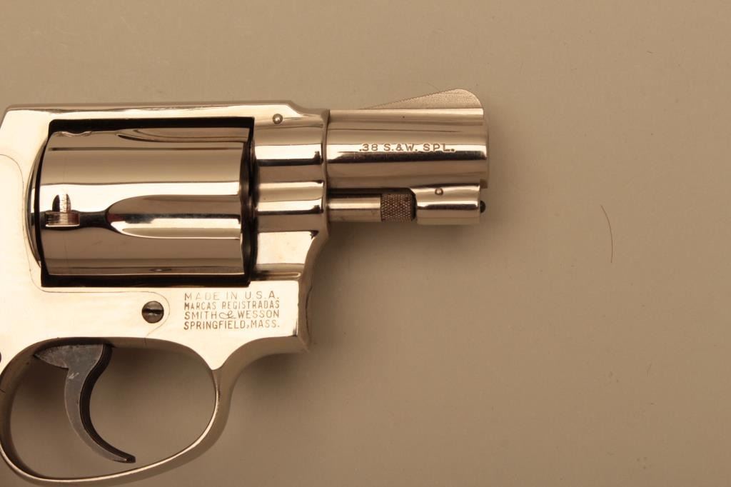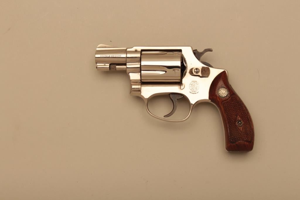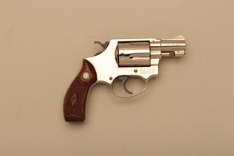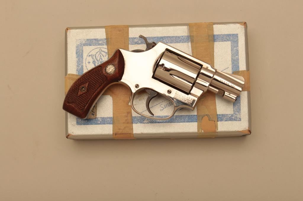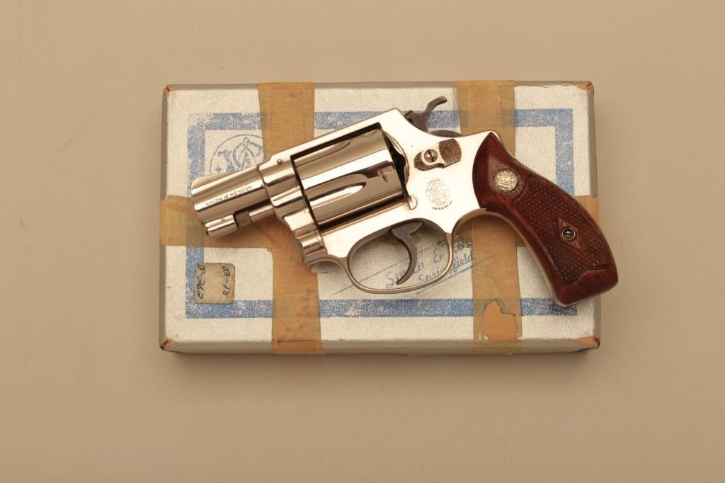 Smith and Wesson Model 36 (no dash) DA revolver, .38 Special caliber, 2” barrel, nickel finish, checkered wood medallion grips, S/N 422835; overall like new condition with factory two piece silver and bluecardboard box with end label numbered to this gun; lid has old masking tape applied to it. (C&R). Est.: $500-$1,000.