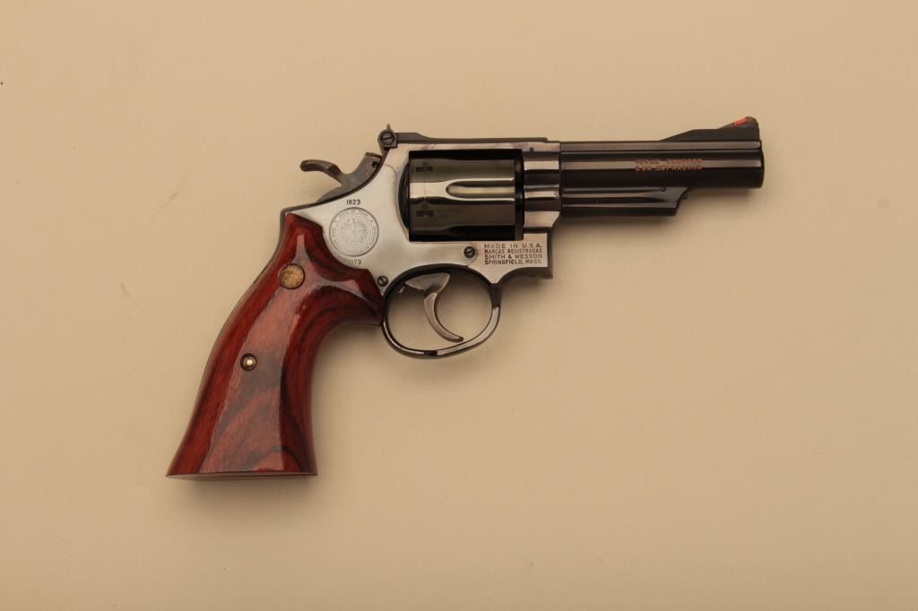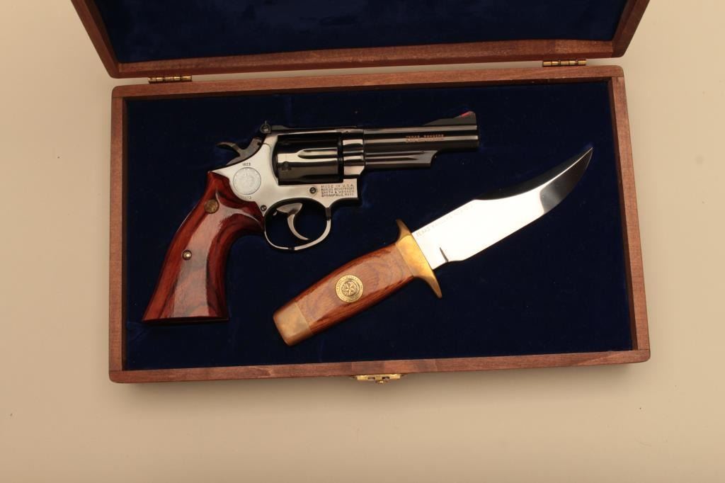 Smith & Wesson Texas Ranger Commemorative Model 19-3 DA revolver, .357 Magnum caliber, 4” barrel, blued finish, smooth wood medallion combat grips, S/N TR7699; overall like new with factory presentation wood caseand Texas Ranger Commemorative knife. (C&R). Est.: $700-$1,400.
