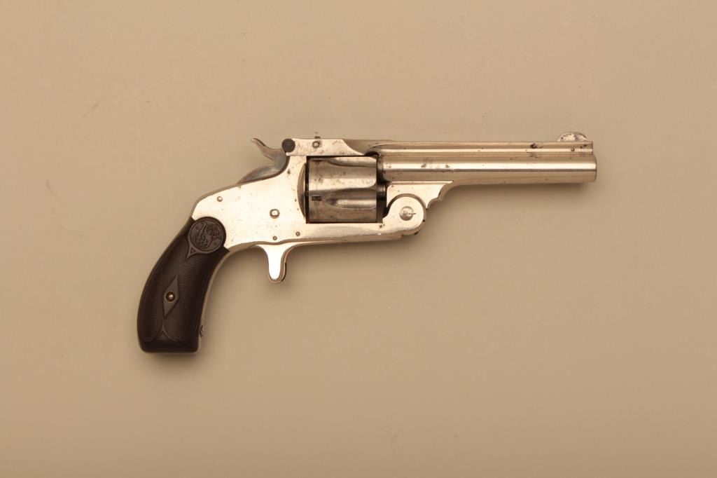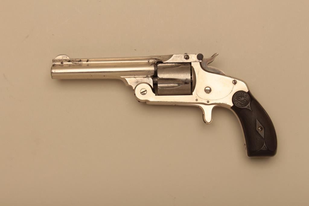 Smith & Wesson Model of 91 38 Single Action Third Model (“Mexican Model”) revolver, .38 S&W caliber, 4” barrel, nickel finish, checkered hard rubber grips, S/N 8122; overall very good to fine condition withmajority of original finish, good bore, crisp action, fine markings and very good grips. (Antique). Est.: $600-$1,200.