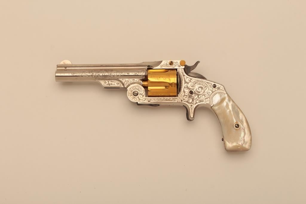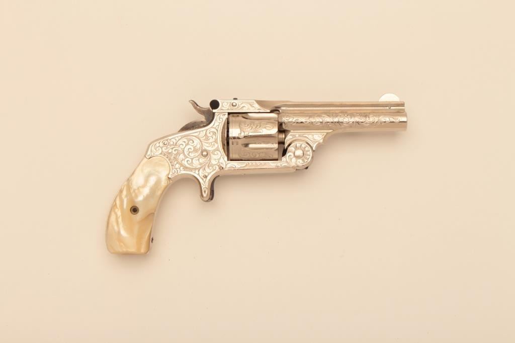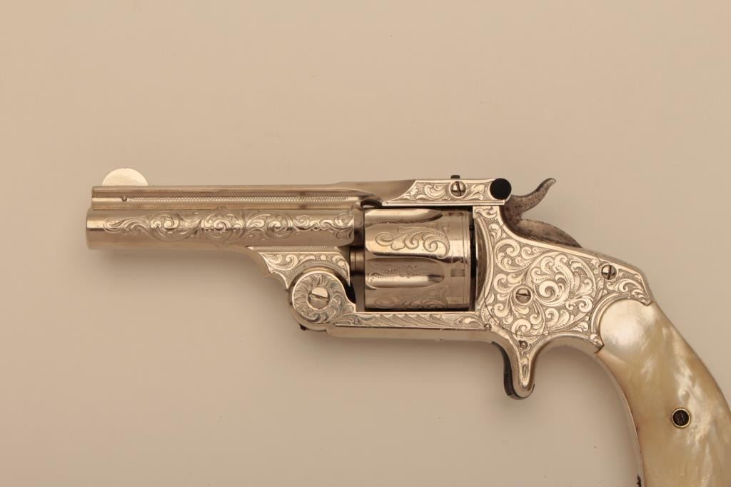 Smith & Wesson 38 Single Action Second Model spur trigger revolver, Nimschke engraved, nickel finish, pearl grips, S/N 21278 with return to factory star under the cylinder shell ejector mechanism; overall very goodcondition as possibly factory re-finished, good bore, good action, sharp markings and fine engraving; beautiful iridescent pearl grips. (Antique). Est.: $900-$1,800.