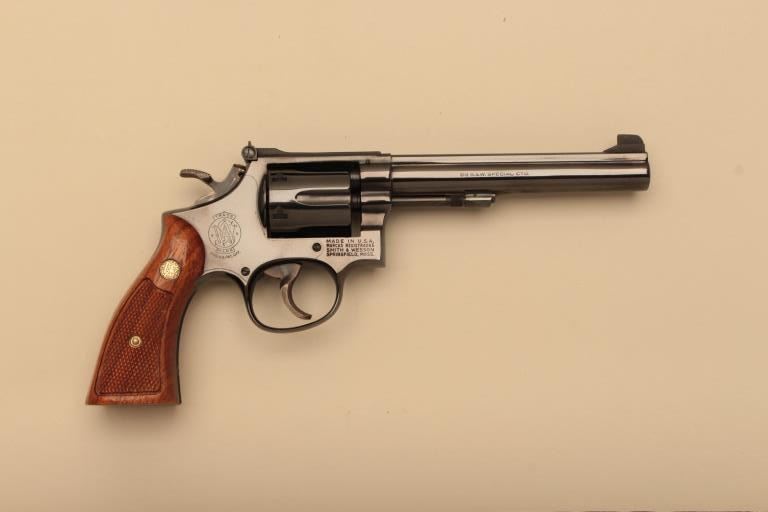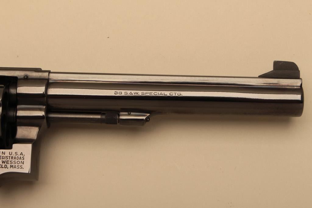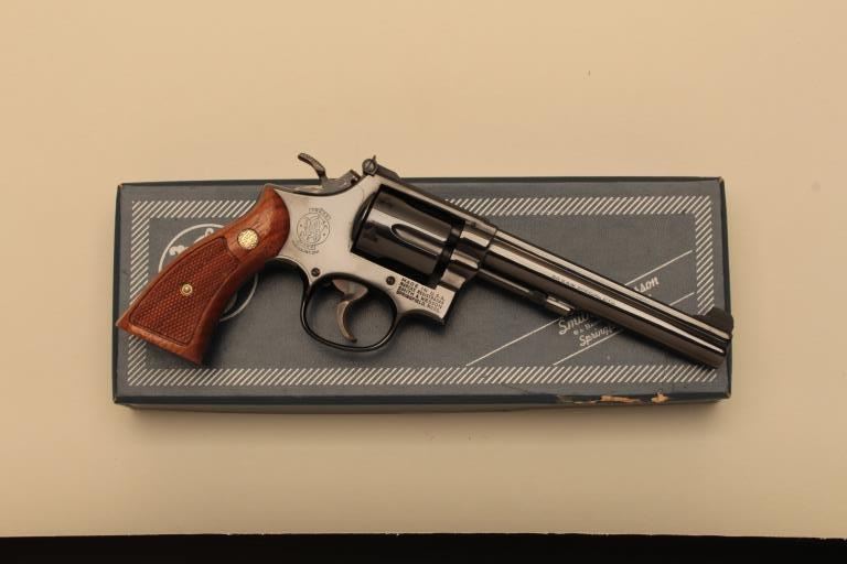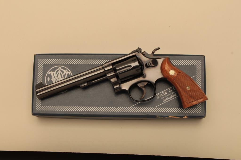 Smith & Wesson Model 14-3 DA K-38 Masterpiece revolver, .38 Special caliber, 6” barrel, blued finish, checkered wood medallion grips, S/N 1K32467; overall like new condition and accompanied by a factory two piece cardboardbox. (Modern/NO CAL. SALE). Est.: $500-$1,000.