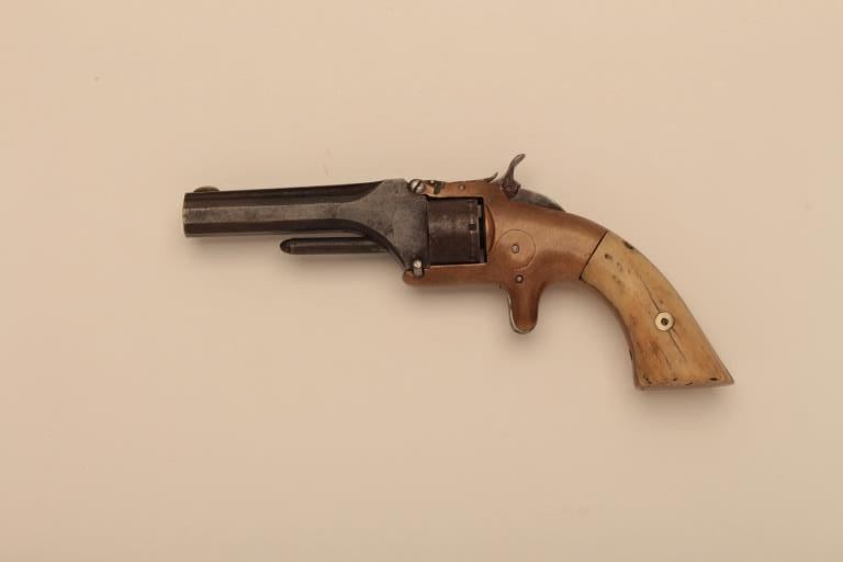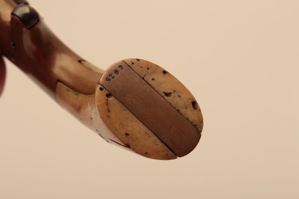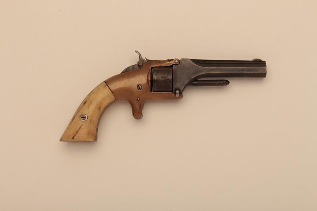 Smith & Wesson Model No. 1 First Issue spur trigger revolver, .22 short RF caliber, 3-3/16” barrel, brass frame, bone grips, S/N 6615; overall good to very good condition with taffy colored patina to brass frame andscattered muted areas of blued finish on barrel mixed with plum patina, very good markings, crisp action, classic grips. (Antique). Est.: $1,000-$2,000.