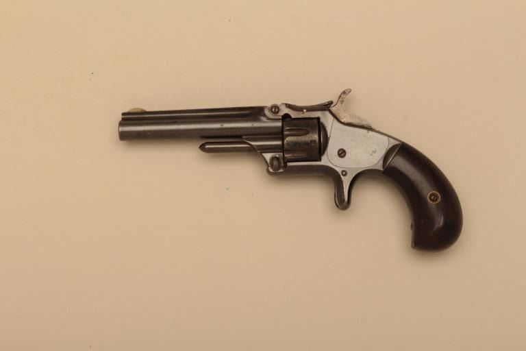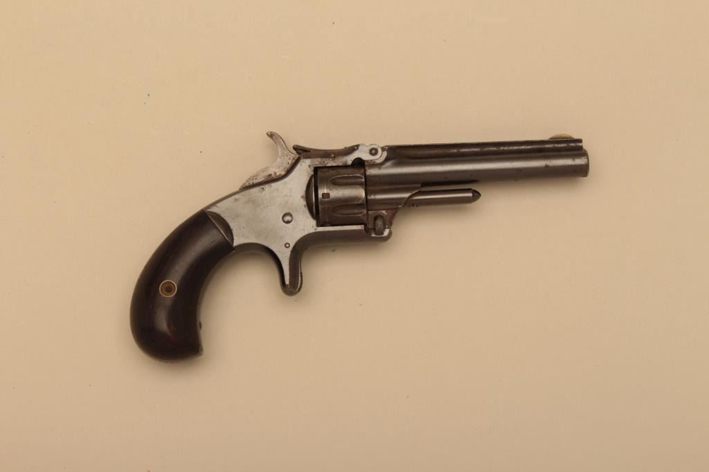 Smith & Wesson Model No. 1 Third Issue spur trigger revolver, .22 short RF caliber, 3-3/16” barrel, blued finish, rosewood grips, S/N 53959; overall good to very good condition with dark patina to metal surfacesand areas of pinprick pitting, crisp action, good markings and very good grips. (Antique). Est.: $250-$500.