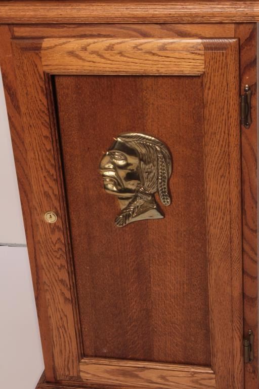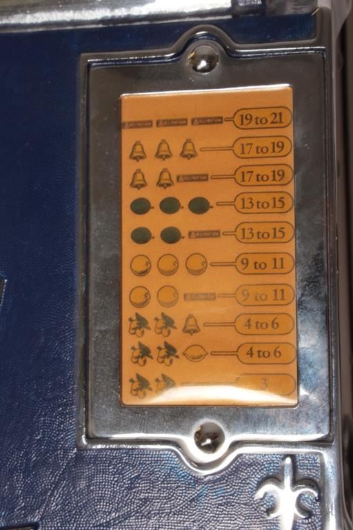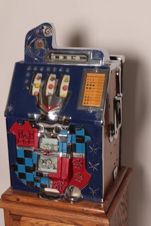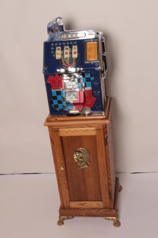 Mills Castle Front 10 cent slot machine, approximately 26” in height, working at time of description, with key and with fancy wood stand including storage; approximately 34” in height and 17” x 17” square. Est.:$800-$1,600.