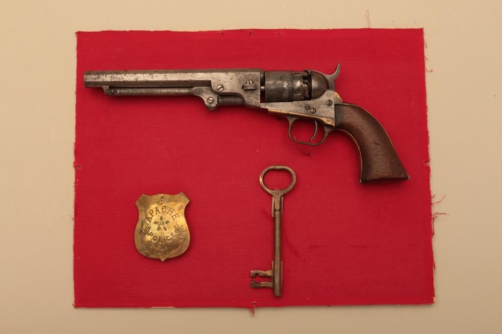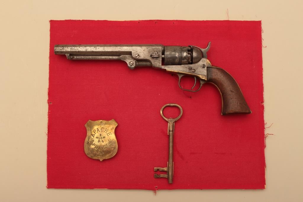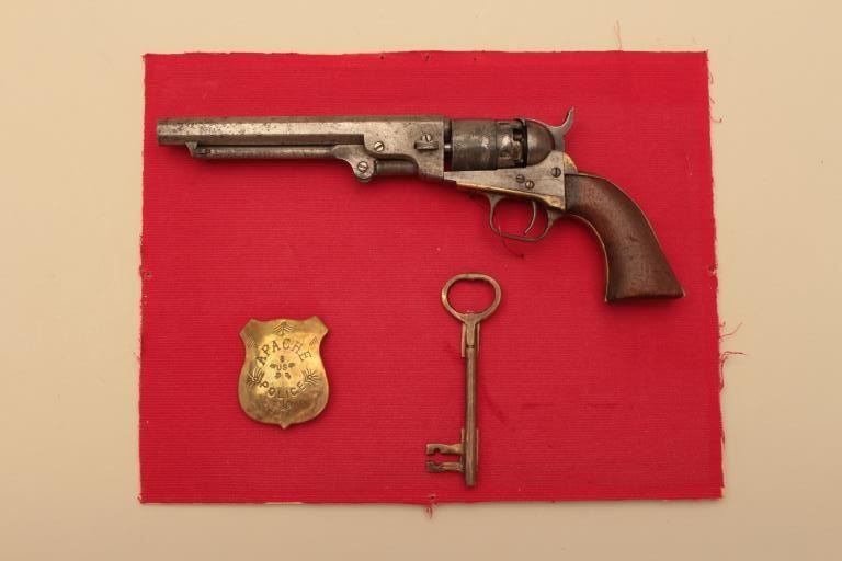 Colt .36 caliber Pocket Navy with a 6 ½” barrel, S/N 10556 in display case and from an old collection. Fair overall with matching visible numbers. Light to moderate pitting. The grips are lightly refinished. Not quiteworking. With reproduction display badge and key. The 6 ½” pocket Navy is scarce. (Antique) Est.: $800-$1600