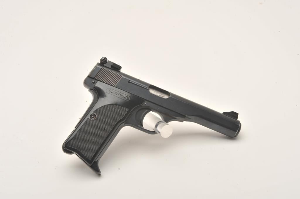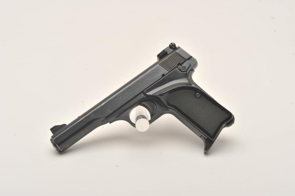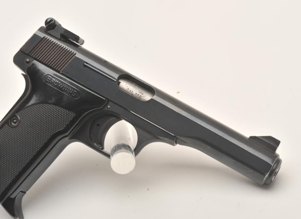 Browning 1955 Target, #71N01720, .380 ACP, 4 3/8" barrel, blued, adjustable sights, with checkered thumb rest grips. Pistol is in near fine condition overall, showing the majority of it's original finish, some minorspots of erosion starting on the back right side and backstrap. Markings are sharp, bore is very good as is action. (Modern/PPT) Est. $400-800