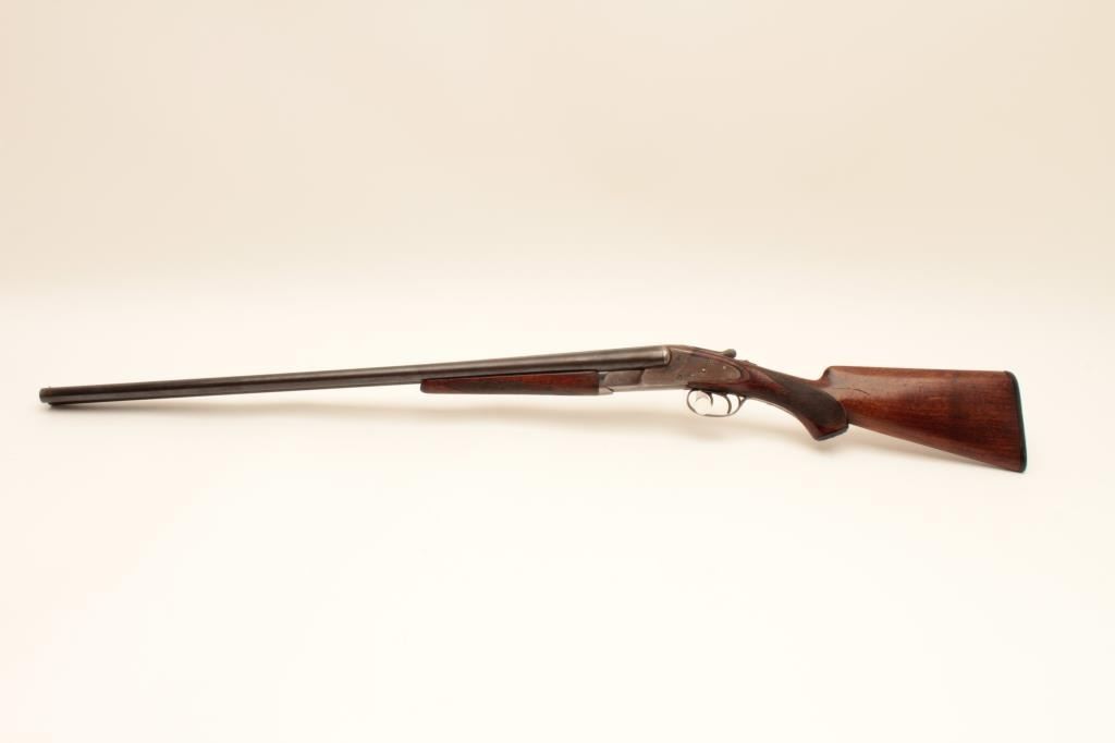 Baker Batavia Leader 20GA SxS shotgun, S/N 6977F with 28” barrels choked improved cylinder in the right barrel and modified in the left barrel, double triggers, and standard extractors. Measures 14 3/8” to theend of the buttplate. Locks up and good to very good bores. 75% plus blue. Traces of case on locks, and the wood is good with normal wear and imperfections. Made Pre purchase by L.C. Smith. (C&R) Est.: $400-$800