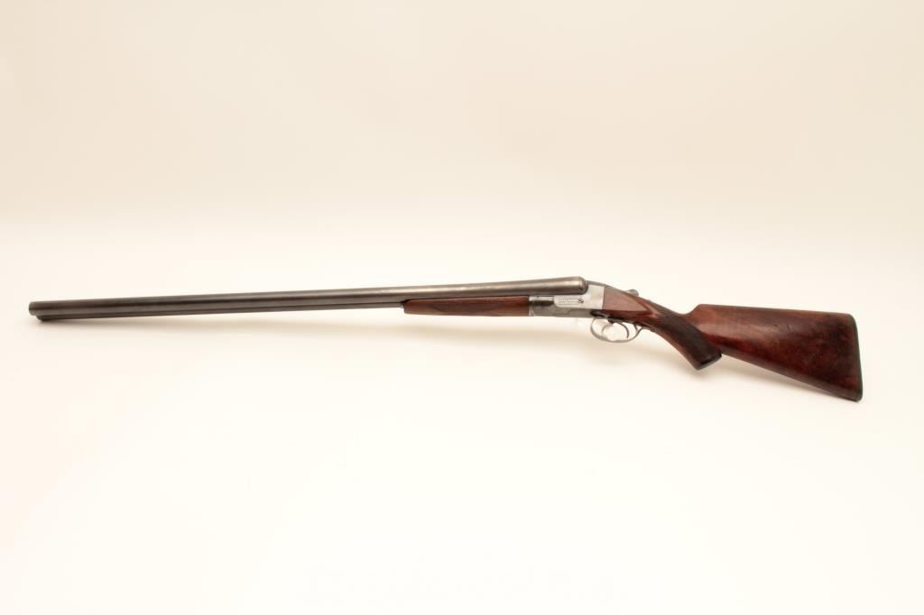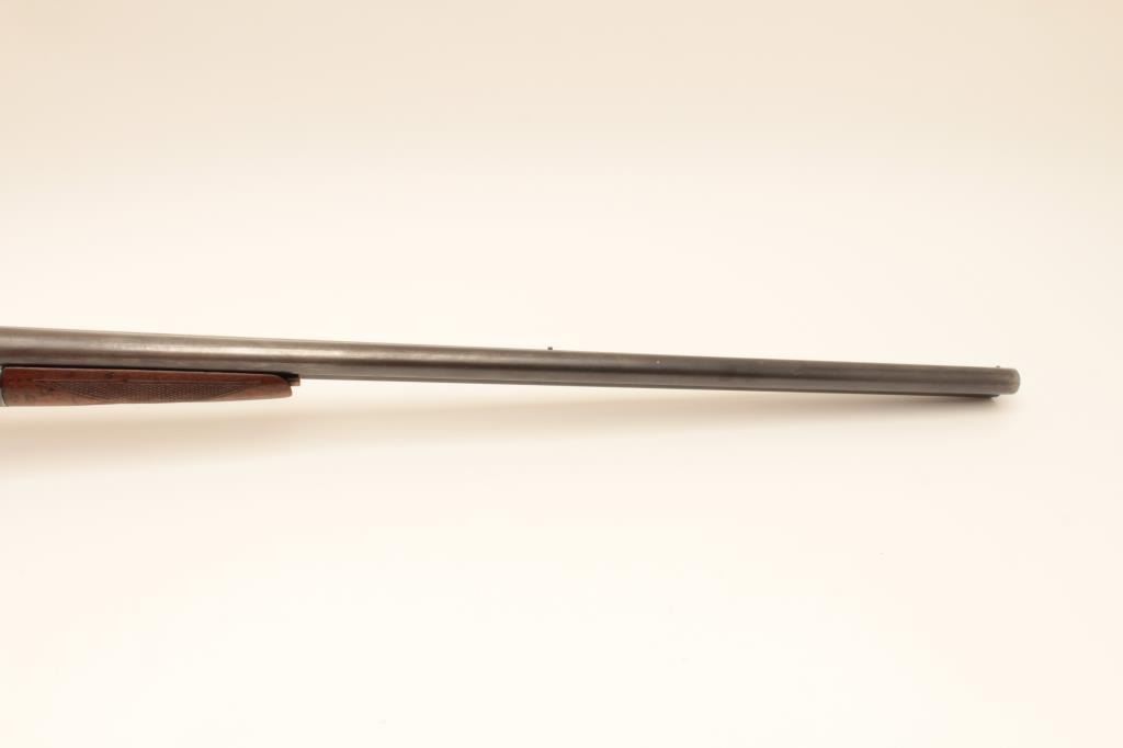 Hopkins and Allen 12GA SxS shotgun with 30” steel barrels, double triggers, and standard extractors, S/N 22058. Good condition with 50%-70% original drifting blue. The stocks are good with some dings and mars into a very nice burled wood butt stock. Improved modified in the right barrel and modified in the left barrel. Measures 13 7/8” to the end of the plate. Locks tight with good bores. (C&R) Est.: $200-$400