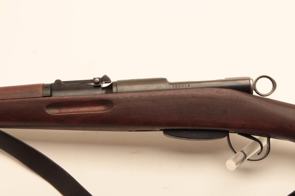 Waffenfabrik Bern Model K1931 Karabiner straight pull rifle, 7.5 x 55mm Swiss caliber, 26” barrel, blued finish, wood stock with leather sling, S/N 785319, all matching visible #s; in overall very good to finecondition with fine bore, crisp action, sharp markings and near fine wood; import marked on underside of barrel at muzzle. Per consignor’s additional notes, Swiss soldier’s white stock tag located inside buttplate,affixed to rear of butt stock. One side has full serial number “785319” and the other has, in three lines, “27 Voser, Johann” (Year of birth, 1927, last name, first name) over “Fus Stabskp 46” (Assigned Unit: shorthandfor Fusilier Stabs Kompagnie 46 which translates to Soldier of Staff Headquarters Company 46) over “Bern Seftigenstr 56” (residence or where served, shorthand for Bern Seftigenstrasse 56). (C&R).Est.: $150-$300.