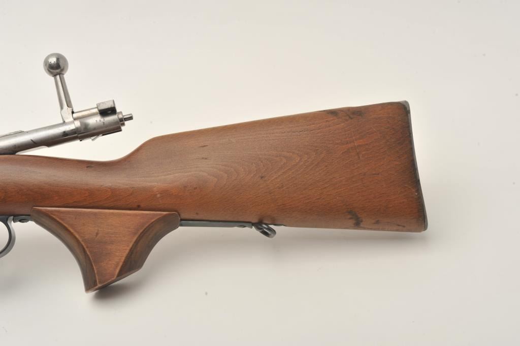 Husqvarna Model 1896Swedish FSR Mauser bolt action rifle, target sights, 6.5 x 55mm caliber, 29” barrel, blued finish, wood stock with added semi-pistol grip, S/N 700783, overall very good to near fine condition with near fine bore, crisp action, sharp markings and very good wood; two interesting metal tags pierced onto the right side of the butt stock; one is engraved “IGGESUNDS SKYUTTEFORENINGS/HEDERSPRIS/IIGGESUND 1959”;the other shows a muscular bowman surrounded by the lettering “STOCKHOLMS – TIDNINGENS/RIKSSKKYTTETAVLING” and dated 1960. Might be researchable. (C&R). Est.: $300-$500.