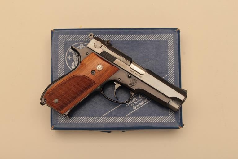 Smith & Wesson Model 39 semi-automatic pistol, 9mm caliber, Serial #62844. The pistol is in very good to nearly fine overall condition with holster wear at the muzzle and high point edge wear along the slide.The checkered wood medallion grips are in very good condition with sharp checkering. The pistol comes in the original blue factory cardboard box with one correct magazine. The bore is good, the action crisp andmarkings are sharp on this lightly used pistol. Est.: $350-$700. (Modern).