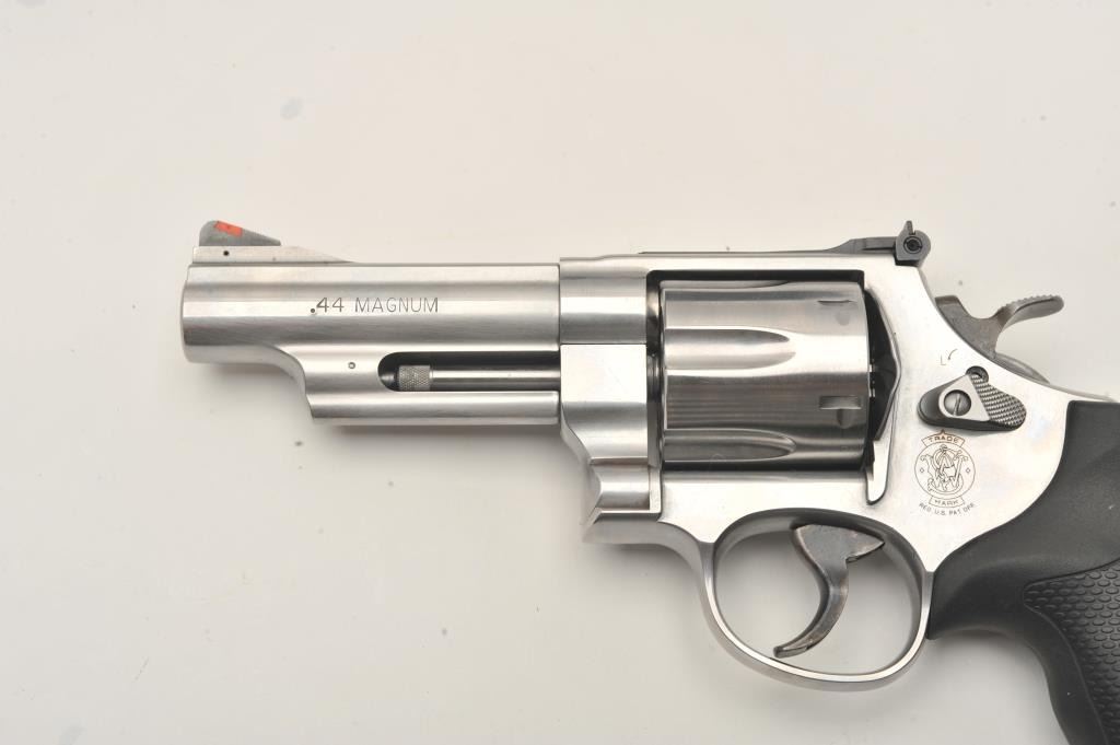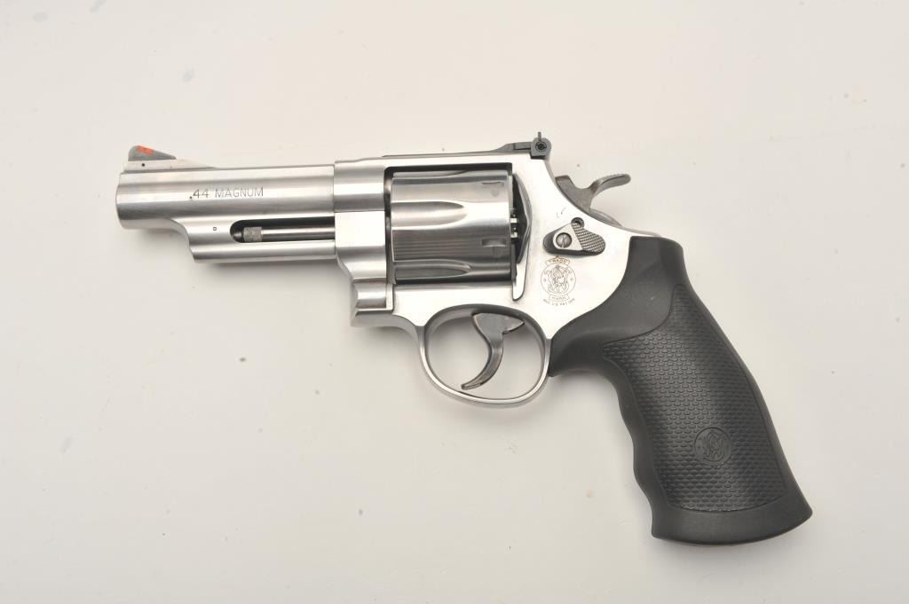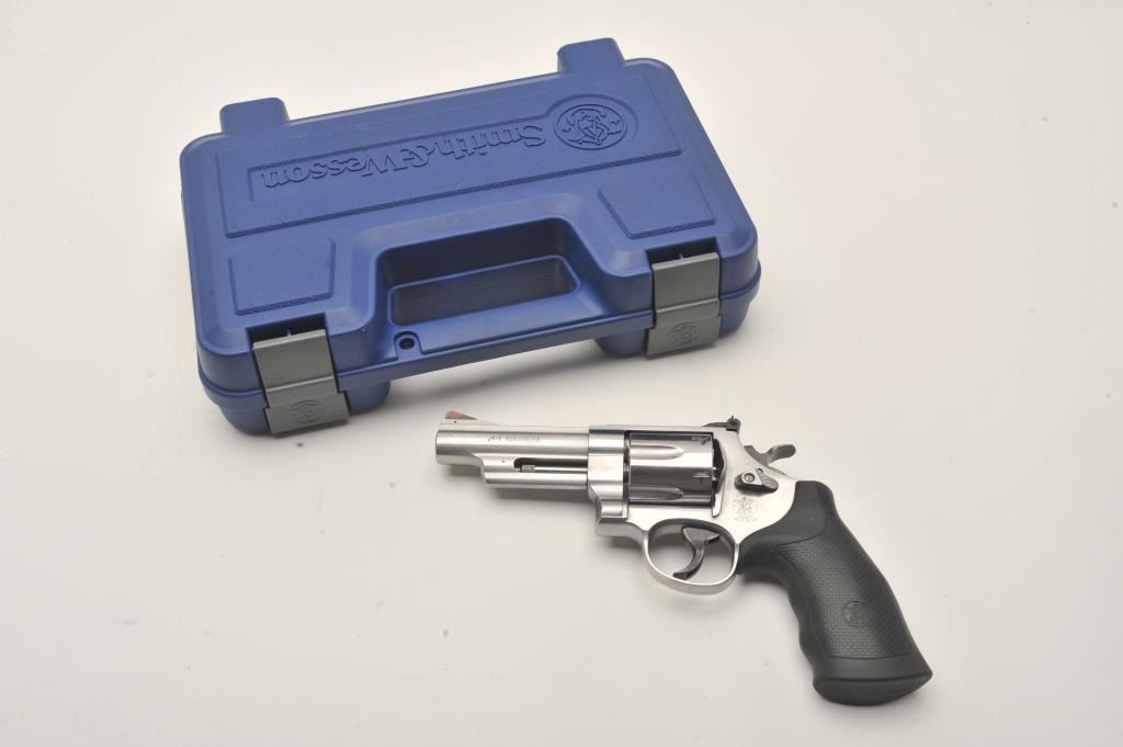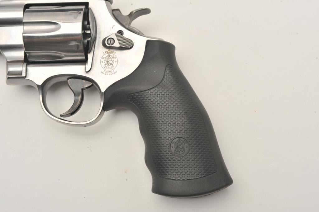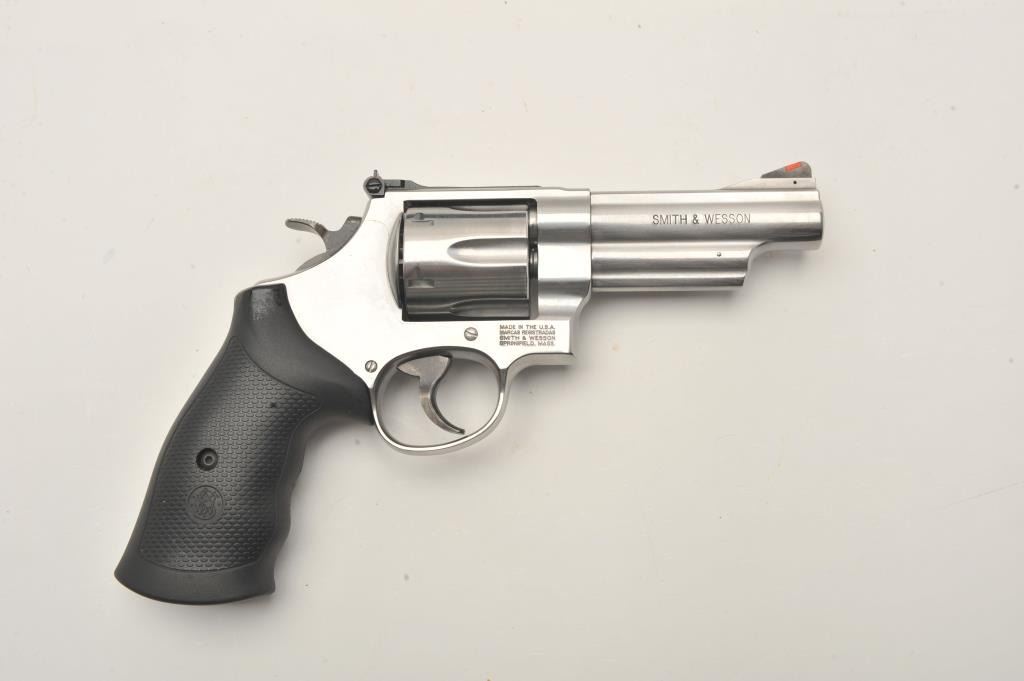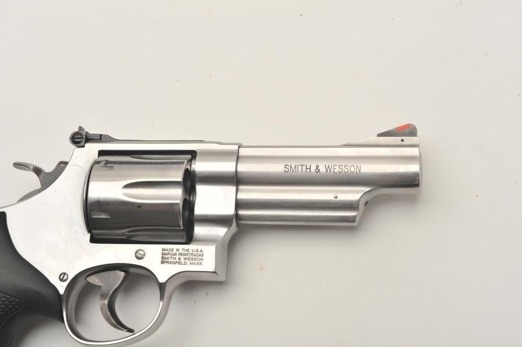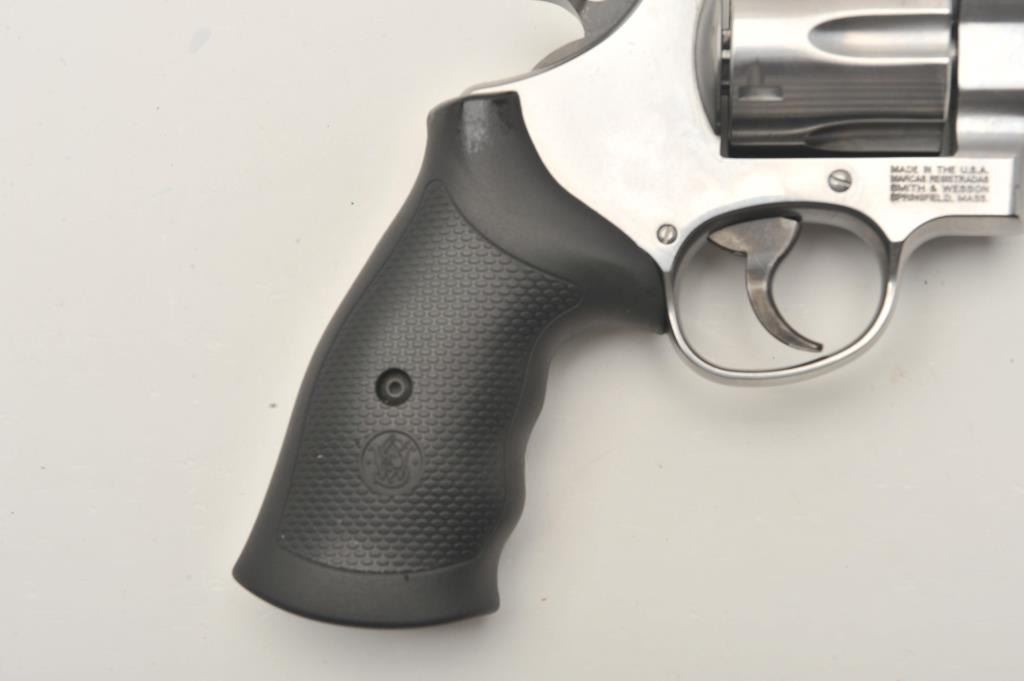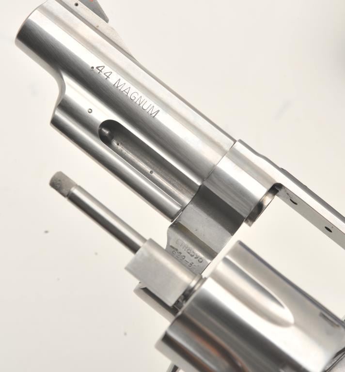 Smith & Wesson Model 869-6 DA revolver, .44 Magnum caliber, 4” barrel, stainless, stippled S&W hard rubber combat grips, S/N CTR8596, in overall fine condition with a fine bore, crisp action, sharp markings andfine grips; accompanied by a factory blue hard carry case. (Modern/PPT). Est.: $750-$1,500.
