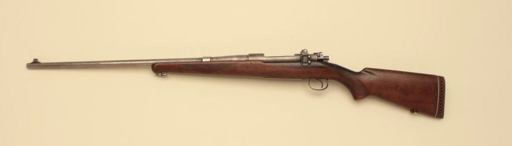 Winchester Model 54 Bolt Action Sporting rifle in .30-06 caliber with nickel steel barrel measuring 25”, S/N 9945. Lightly cleaned gray metal. Slin Swivels and rubber pad added. Also Redfield receiver sightadded. The stocks are worn but sound. The action is good and the bore is fair. Good and very dirty (May improve with a hard scrubbing). A candidate for restoration. Est.: $300-$600