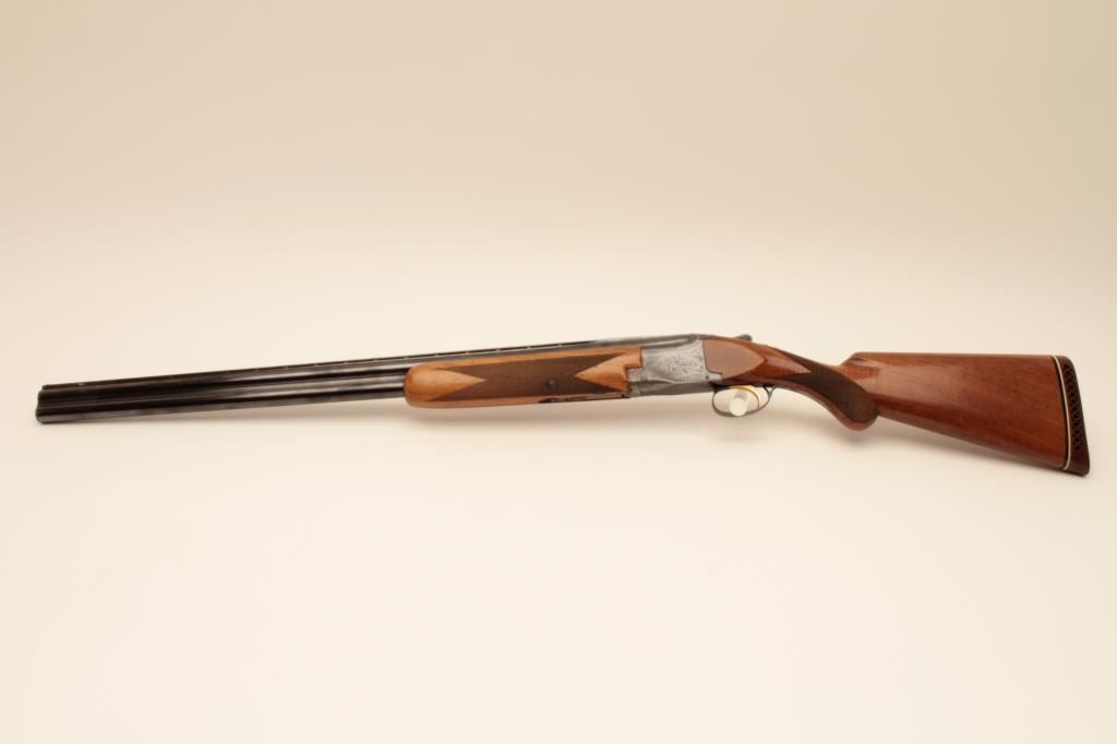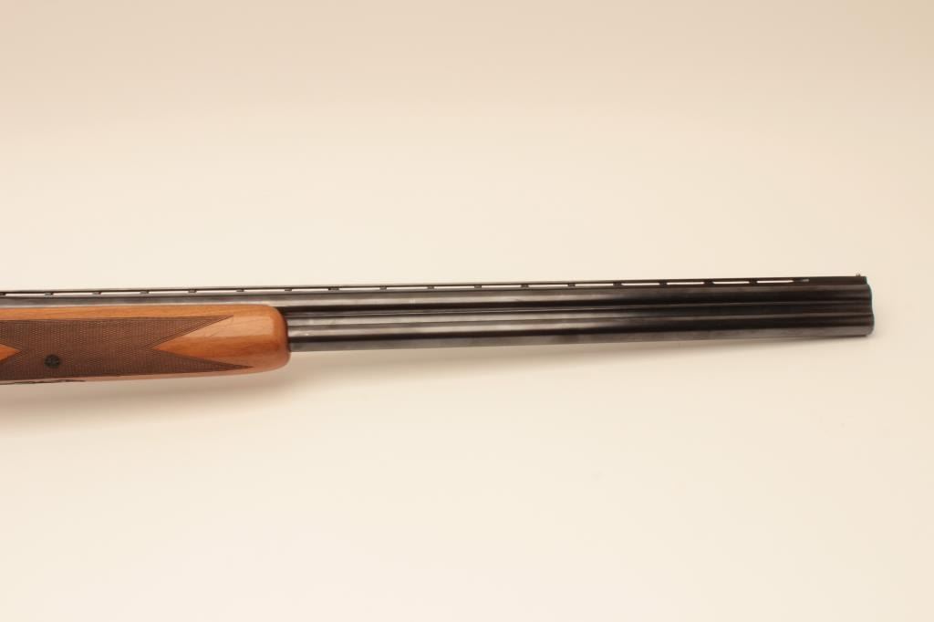 Browning Over/Under Lightning Model Superposed shotgun in 12GA with 30” barrels choked full over modified, low rise vent rib, long tang round knob, single trigger, and auto ejector, S/N 97850. 90%-95% blue on thebarrels. 50%-70% original blue on action with area of light cleaning and erosion. The wood is good plus with dings in fore end and minor scratches in buttstock. Measures 14” to the end of thick pad. Good bores. (C $900-$1800