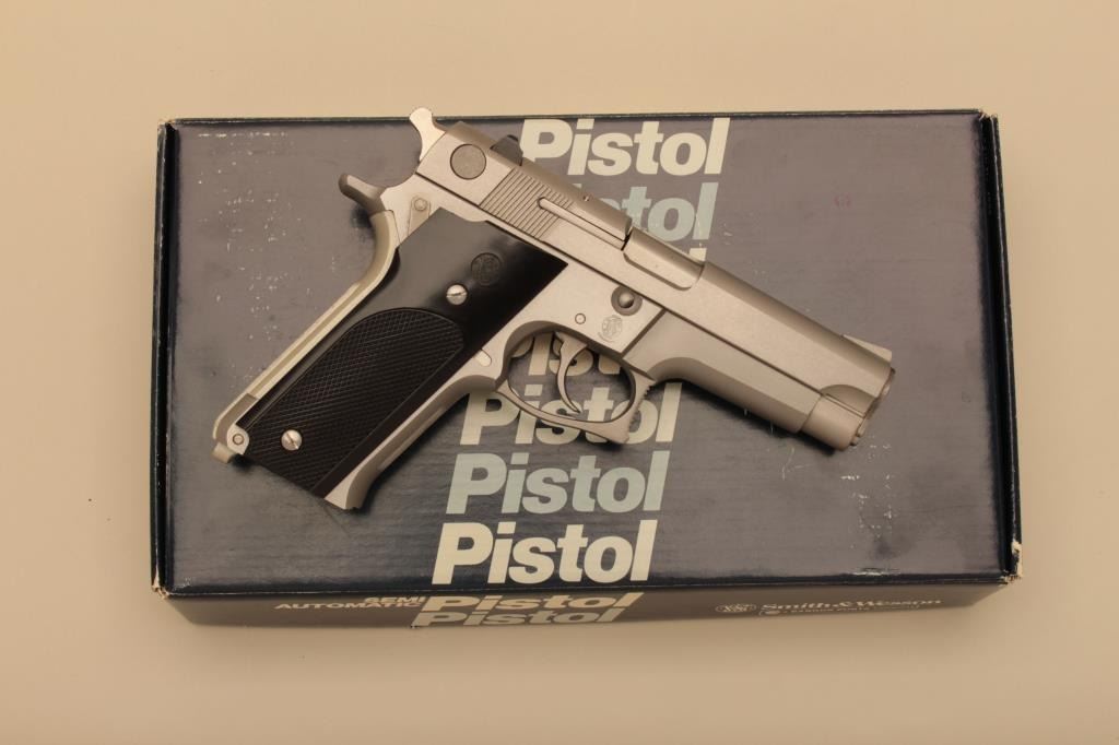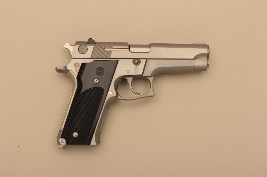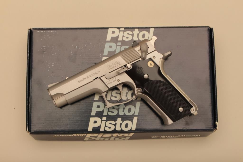 Smith & Wesson Model 659, #A874030, 9mm, 4" barrel, stainless, fixed sights, checkered medallion plastic grips. Pistol is in near fine condition overall, minor handling marks, fine bore, great action, grips are fine with no chips or cracks and have crisp checkering. Gun will improve with a good cleaning. Box indicates special order #4074. Includes box, instructions and 2 hi-cap mag (not transferrable to CA or other prohibited states or areas). (Modern/PPT) Est. $400-800