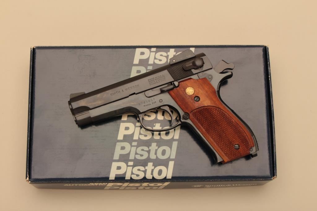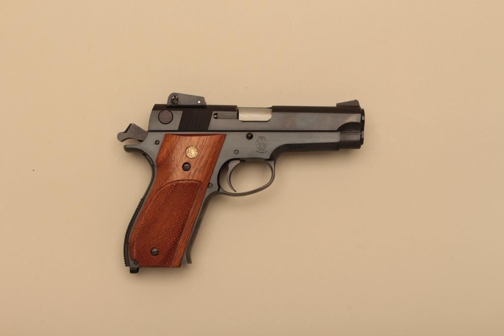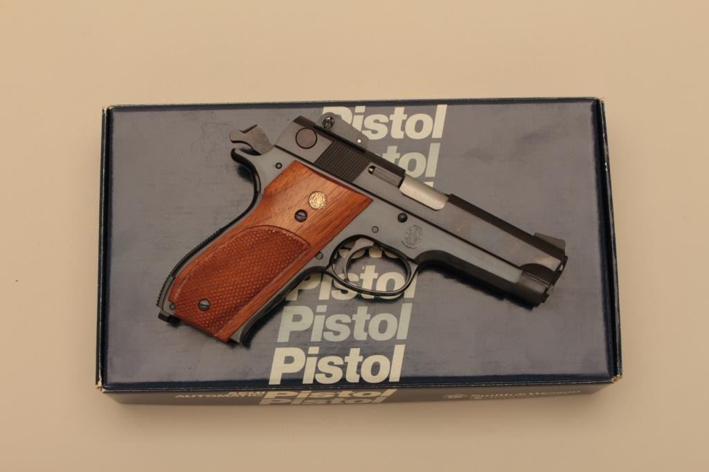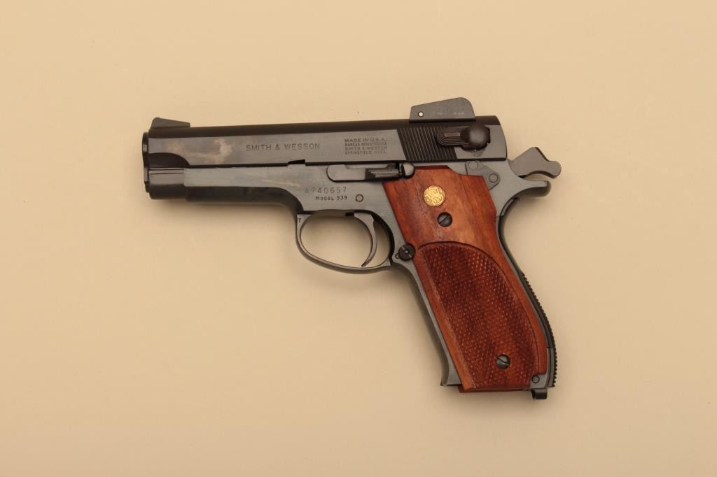 Smith & Wesson Model 539, #A740657, 9mm, 4" barrel, blued finish, rounded trigger guard, adjustable sights, checkered medallion walnut grips. Pistol is in fine condition overall, mint bore, excellent action, grips are finewith no chips or cracks and have crisp checkering. Minor handling marks only. Includes original box, instructions and 2 mags. (Modern/PPT) Est. $350-700