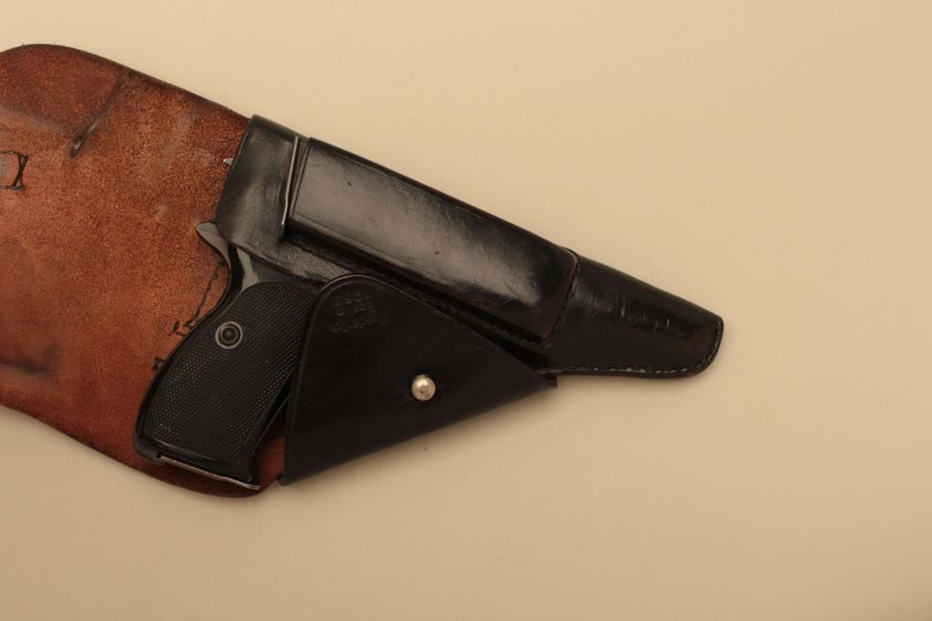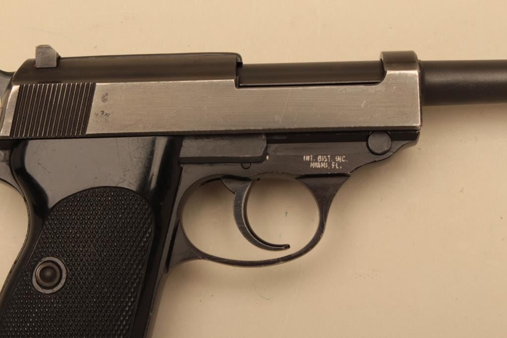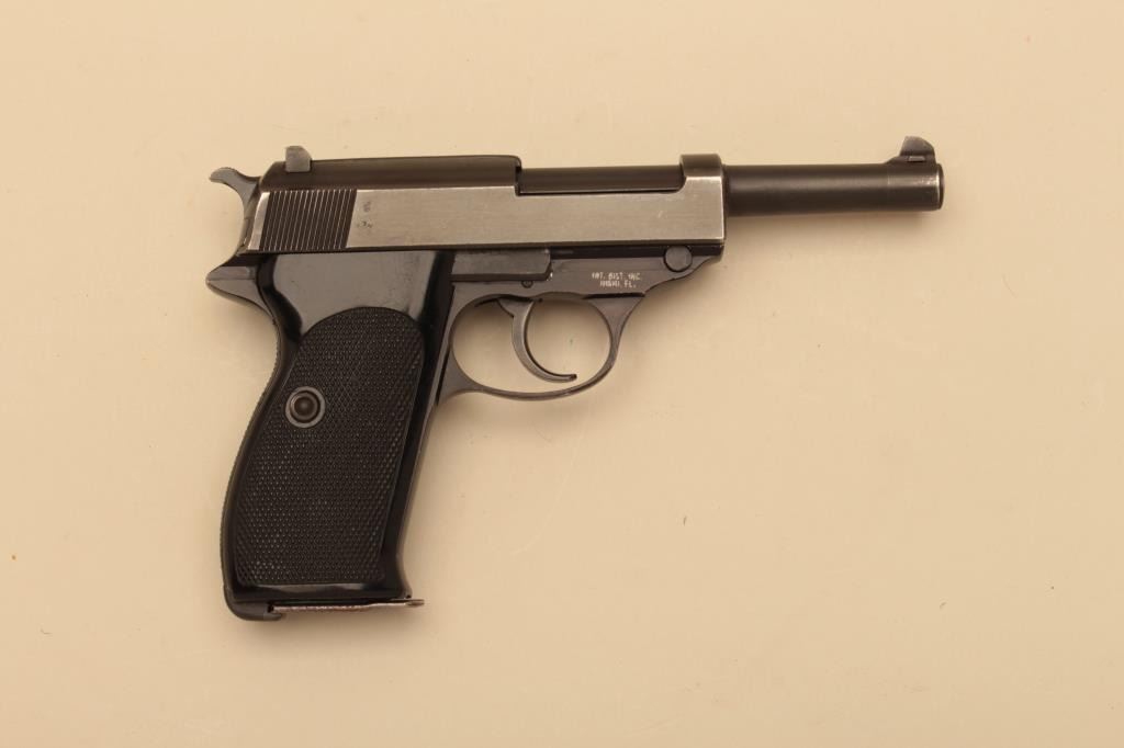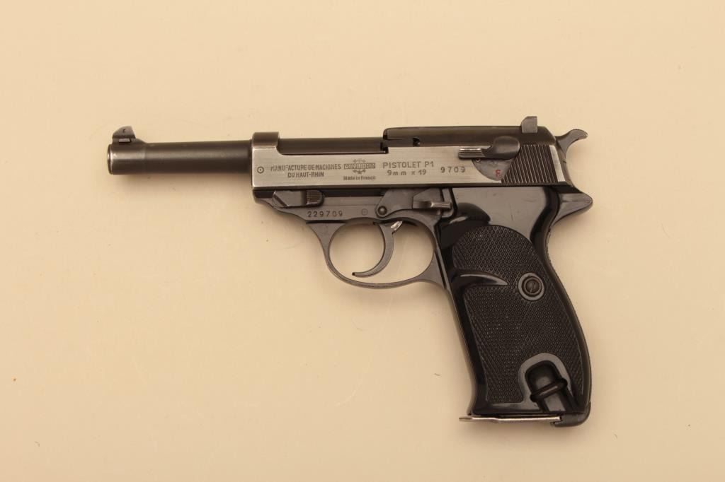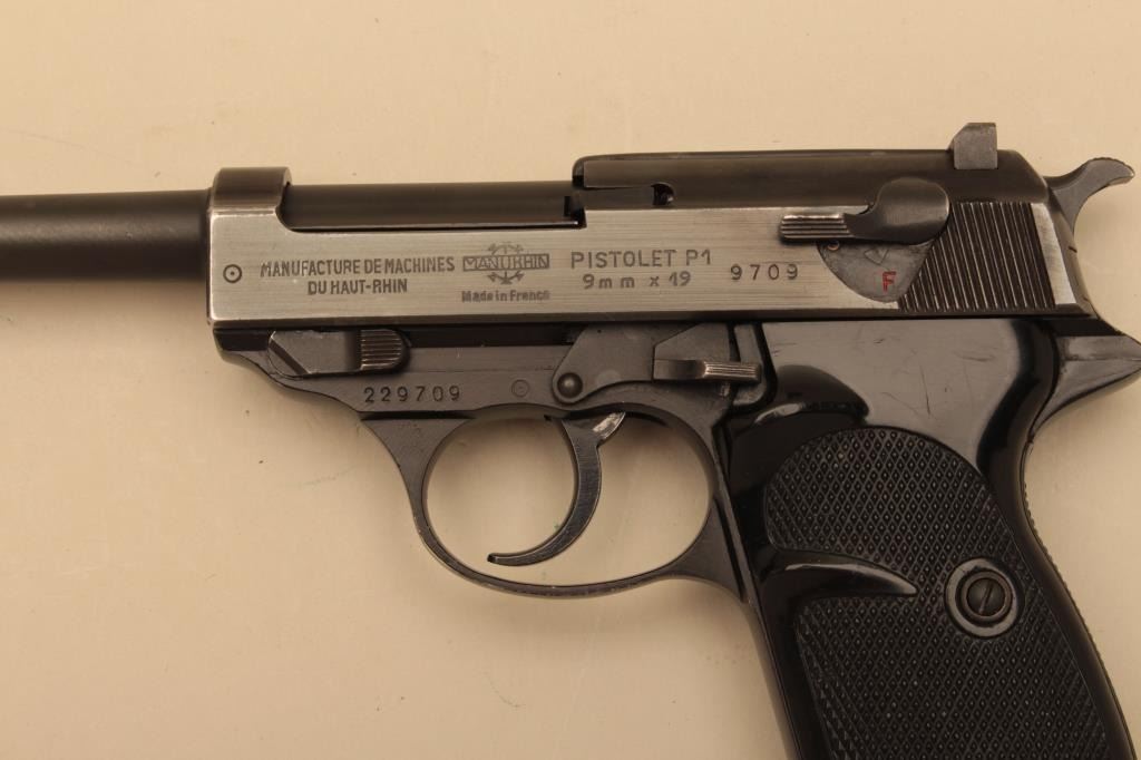 Manurhin P1, #229709, 9mm, 5" barrel, blued finish, plastic checkered grips. Pistol is in very good condition overall, retaining the majority of its original finish. Bore is good, grips are very good. Includes aholster marked "Wunderlich Berlin 1963" and correct 2 mags. (C&R/PPT) Est. $300-600