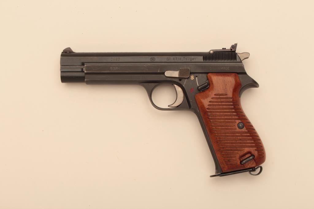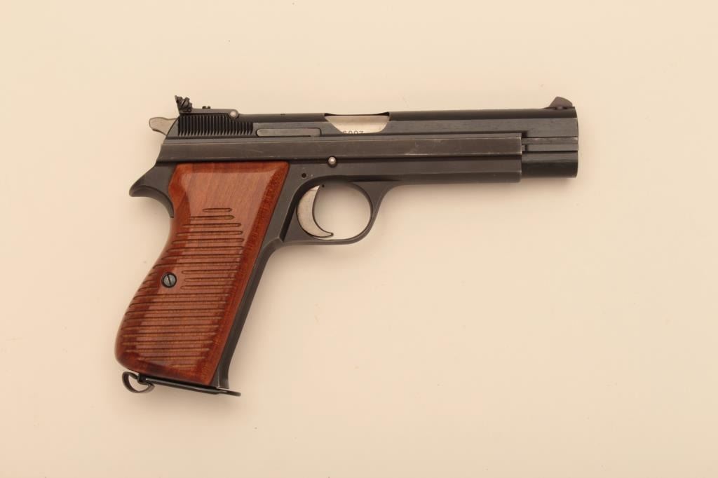 Sig 210 Target, #6923, 9mm, polished blued finish, adjustable sights, beech wood grips. Pistol is in fine condition overall, 92-95% original finish remains, bore is fine, action is excellent. Grips are excellent. 2 mags, Sig mag loader and hand made fitted wooden box included. (C&R/PPT) Est. $3000-6000