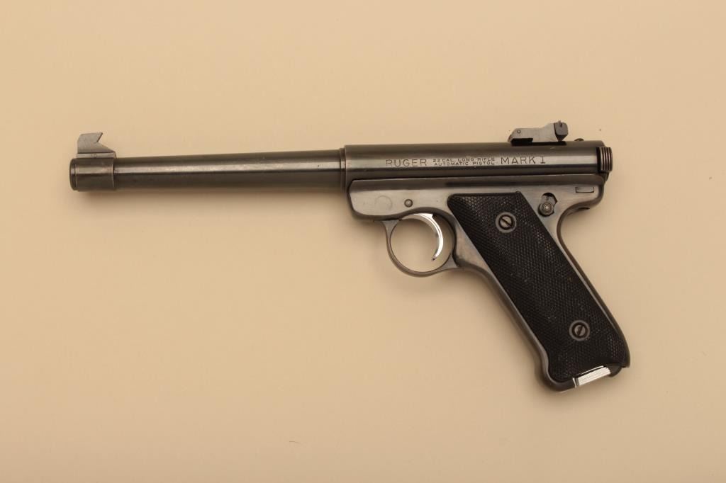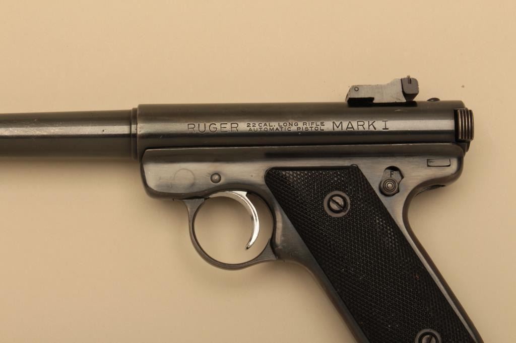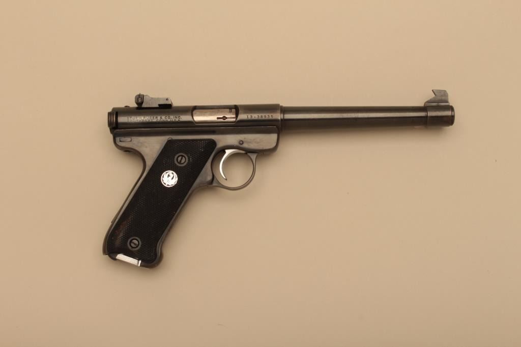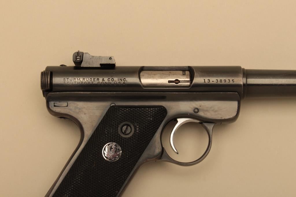 Ruger Mark I semi automatic pistol, #13-38935, .22 LR, 6 7/8" tapered heavy barrel, blued finish, adjustable sights, checkered medallion grips. Pistol is in very good condition overall, showing 80-90%original finish, which is thinning, very good bore and action. Grips are fine with no chips or cracks. One mag. (Modern/PPT) Est. $150-300