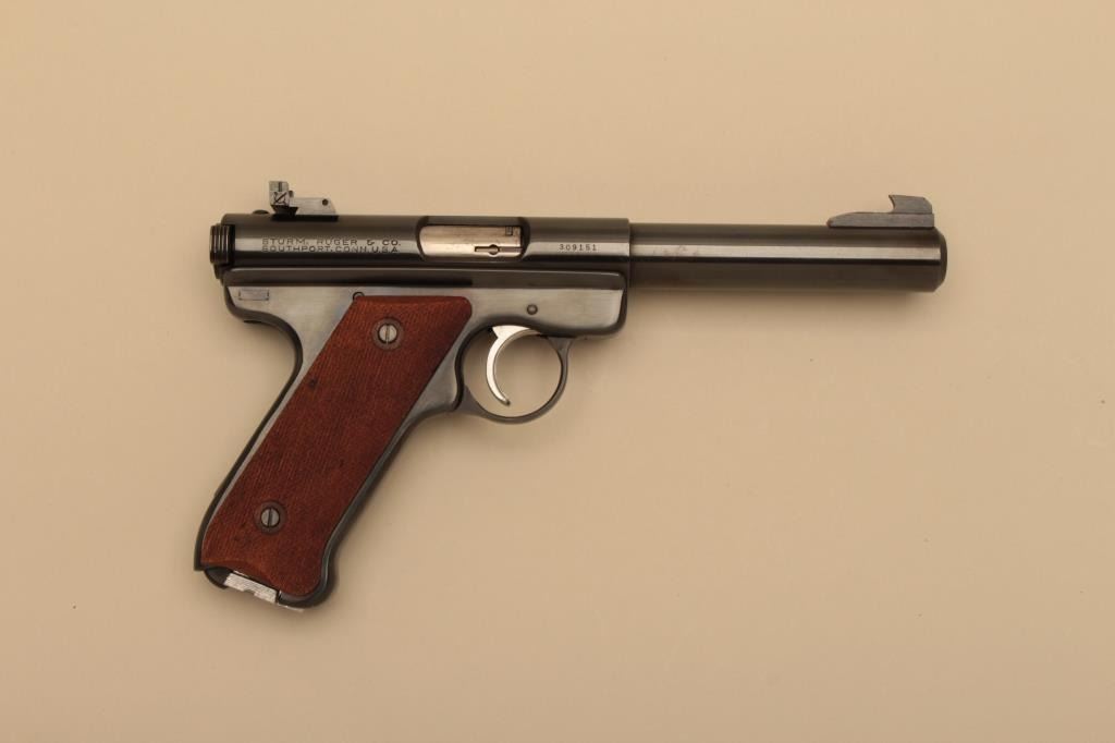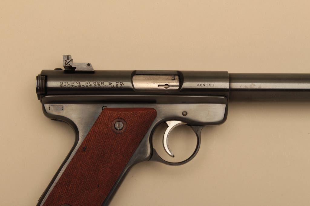 Ruger Mark I semi automatic pistol, #309151, .22 LR, 5 1/2" bull barrel, blued finish, adjustable sights, checkered walnut medallion grips. Pistol is in near fine condition overall, showing 90-95% original finish, very good bore and action. Grips are fine with no chips or cracks. One mag. (Modern/PPT) Est. $200-400