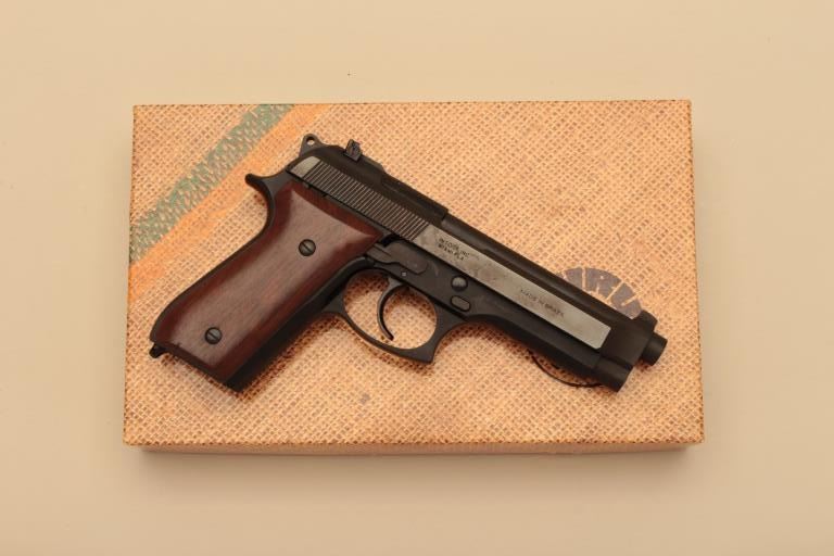 Taurus PT-92, #B31500, 9mm, 4 7/8" barrel, blued finish, lanyard loop, smooth wood grips. Pistol is in fine to excellent condition, showing minimal wear. Bore and action are excellent. Magazine release is on lower left grip panel. In the original box with one hi-cap mag (not transferrable to CA or other prohibited states or areas). (Modern/PPT) Est. $250-500