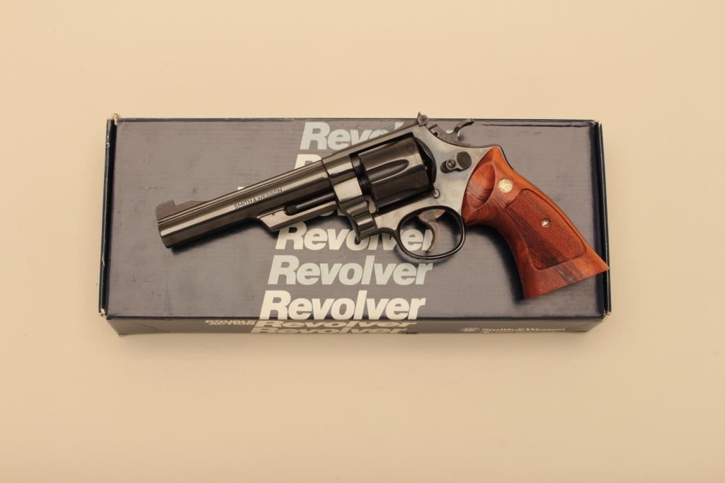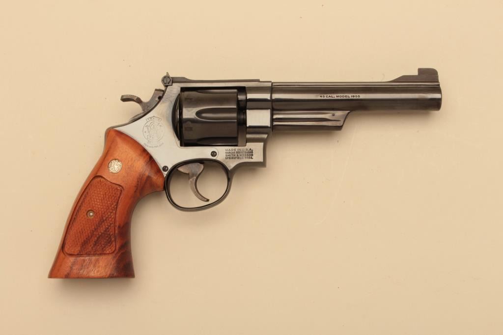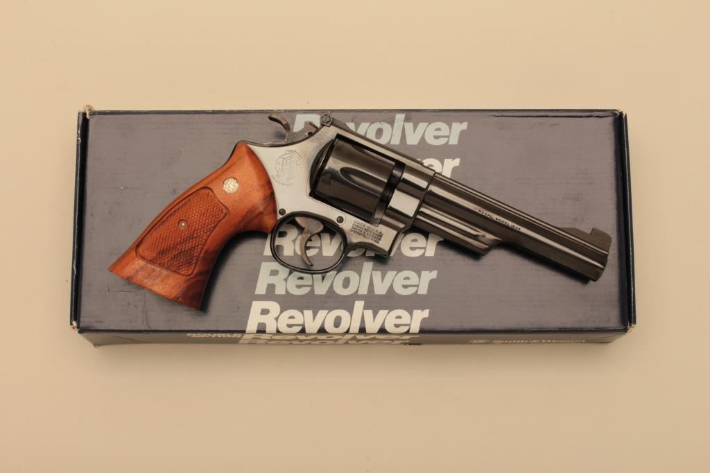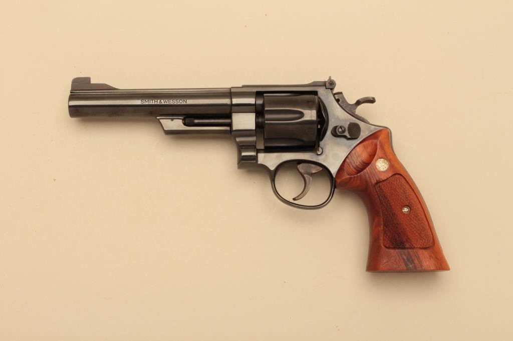 Smith & Wesson Model 25-2, #N900406, .45 ACP, 6" barrel, blued finish, checkered medallion grips. Revolver is in fine to near excellent condition, retaining 97-98% original finish, bore is minty, grips arefine with just minimal handling marks and minimal losses from the factory tooling. Includes original box, cleaning tools, and moon clips and manual. (Modern/PPT) Est. $600-1200
