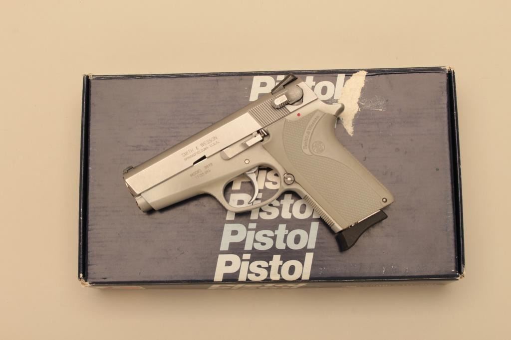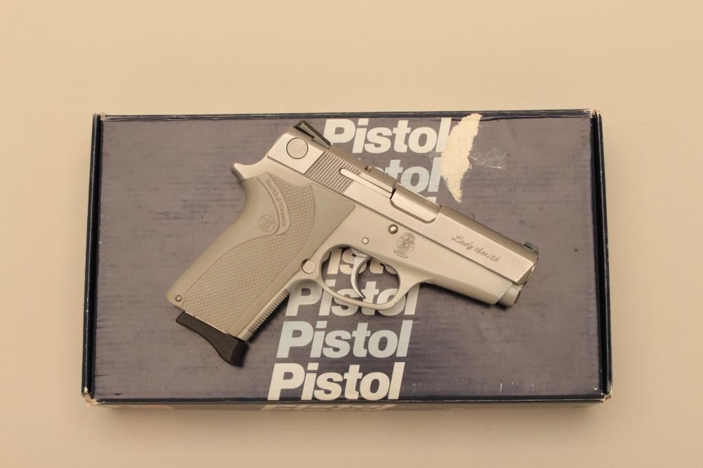 Smith & Wesson Model 3913 Lady Smith, #TFB5958, 9mm, 3 1/2" barrel, stainless, Novak sights, grey checkered logo grips. Pistol is in very good to fine condition overall, with light handling marks. Specialorder #0124 as indicated on the box. Includes original box and one mag. (Modern/PPT) Est. $400-800
