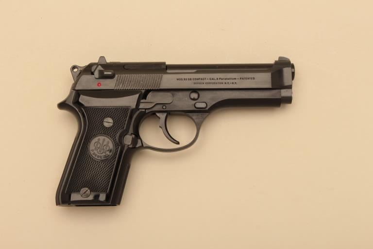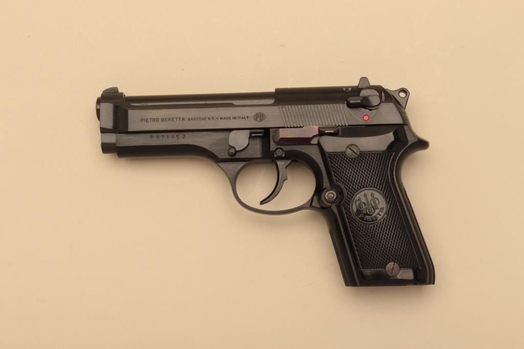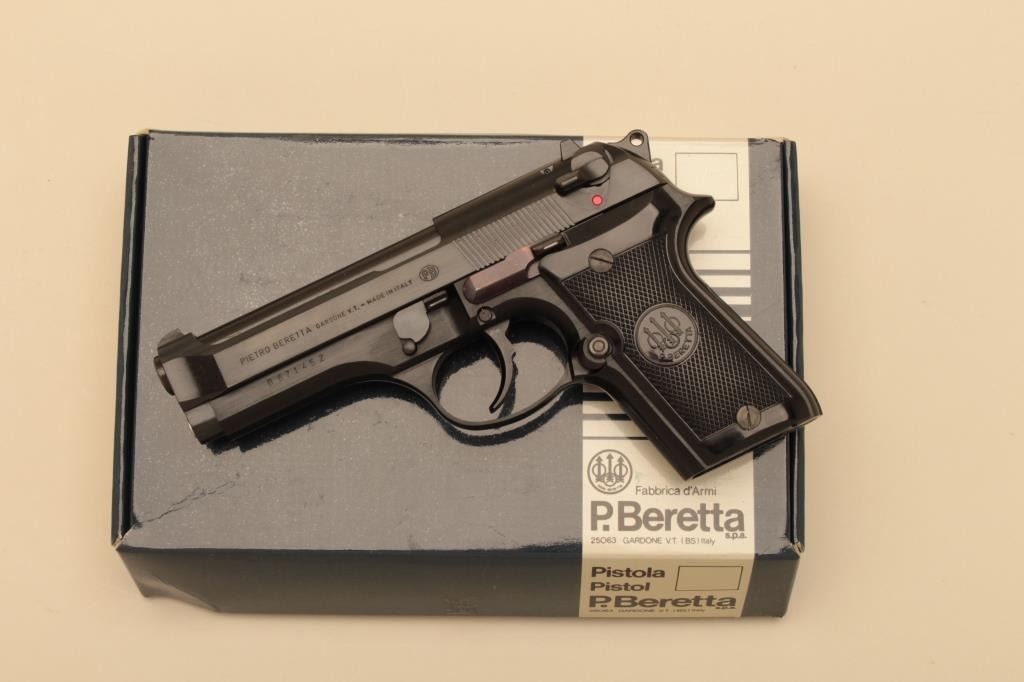 Beretta Model 92SB, #B67145Z, 9mm, 4 1/4" barrel, blued finish, checkered logo grips. Pistol is in near excellent condition overall, 98% original finish, good markings, very good grips, bore is excellent, as isaction. Early magazine release button on the lower left grip panel. Includes original box, manual and one mag (not transferrable to CA or other prohibited states or areas). (Modern/ PPT) Est. $400-800