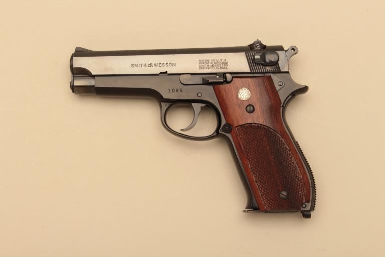Early Smith & Wesson Model Pre 39, #1086, 9mm, 4" barrel, blued finish, adjustable sights, checkered medallion walnut grips. Pistol is in excellent condition overall, showing 98%+ original finish. Very goodbore, excellent action, grips are near fine with no chips or cracks. Minimal handling marks. A very early, pre 39, seldom seen with a very low serial number. Includes original 2 piece box in very good conditionand one mag. (C&R/PPT) Est. $900-1800++