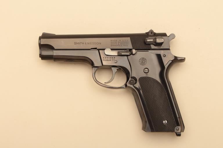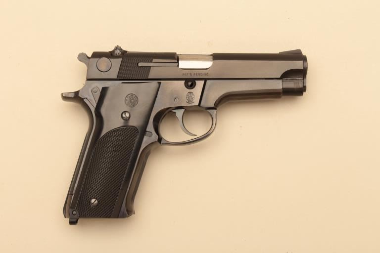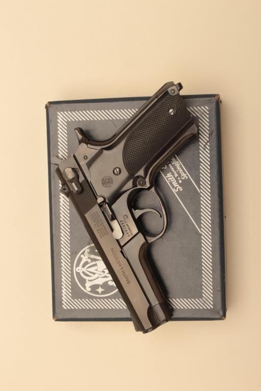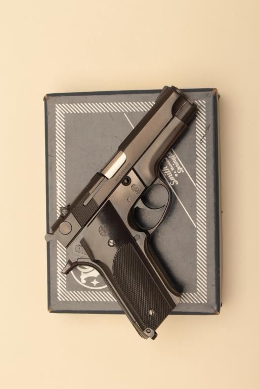 Scarce Smith & Wesson Model 147-A, #A490057, 9mm, 4" barrel, blued finish, adjustable sights, checkered medallion plastic grips. Pistol is in fine+ condition overall, showing 95-98% original finish, mint bore, excellent action, grips are fine with no chips or cracks and have crisp checkering. Very minor scratches from handling. Only 112 model 147-As were made in 1979. Includes original two piece box, instructions and 2 hi-cap mags (not transferrable to CA or other prohibited states or areas). (C&R/PPT) Est. $500-1000