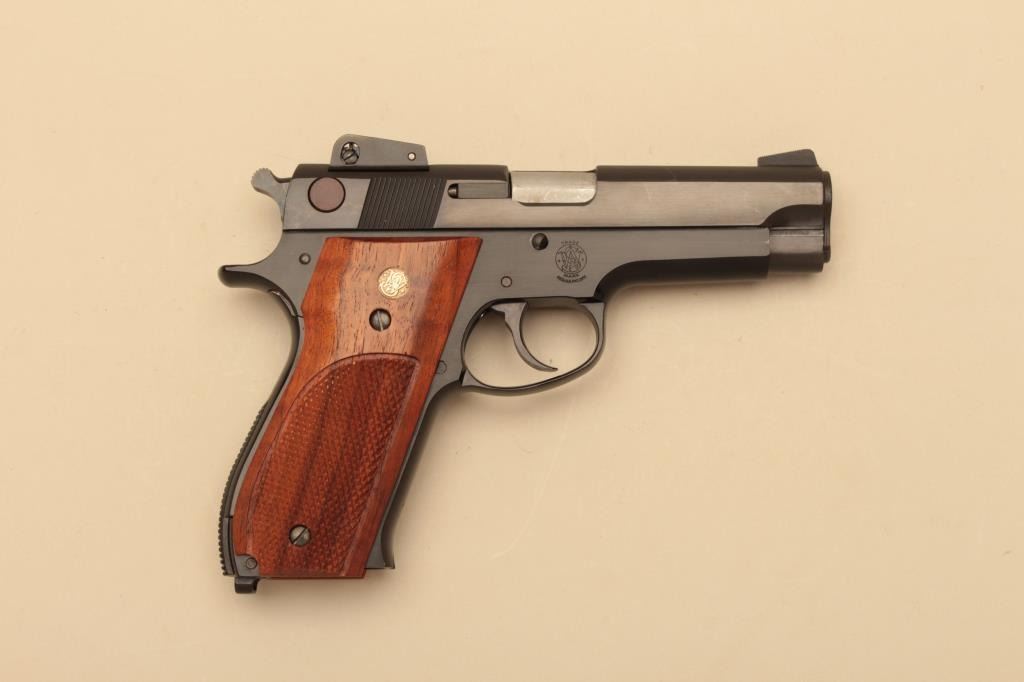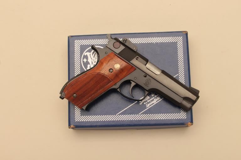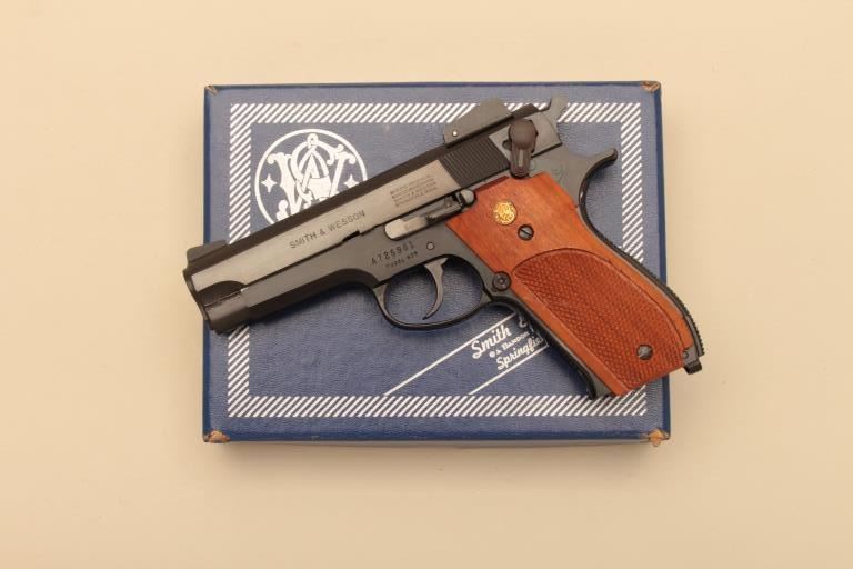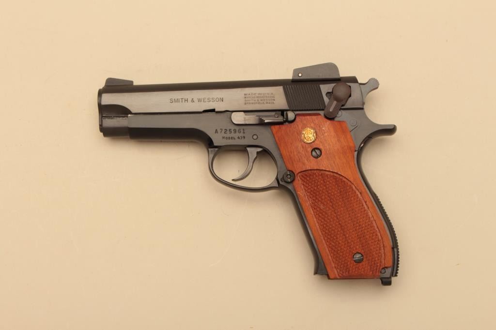 Smith & Wesson Model 439, #A725961, 9mm, 4" barrel, blued finish, adjustable sights, checkered medallion plastic grips. Pistol is in fine condition overall, showing 95-98% original finish, mint bore, excellent action, grips are fine with no chips or cracks and have crisp checkering. Minor handling marks. Includes box, instructions and 2 mags. (Modern/PPT) Est. $300-600