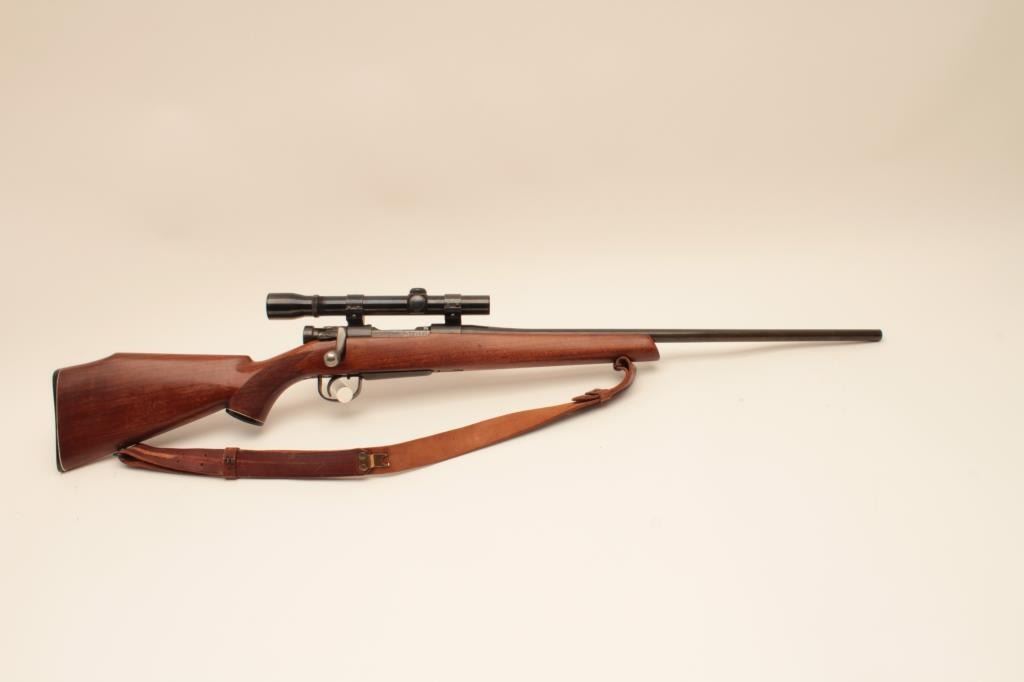 Sporterized Japanese Arisaka bolt action rifle, .308 Winchester caliber, Serial #86572. The rifle is in good overall condition as sporterized with a 22” barrel. The metal surfaces retain the majority oftheir thinning blue finish with the remainder going to grey patina. The custom checkered wood stock is in good condition with mars and scratches from carry and use. The bore is good, the action is crisp and markings arelegible. The lot includes a leather military style sling and the rifle is topped with Weaver rings and a Weaver K3 fixed power scope. Est.: $200-$400. (C+R).
