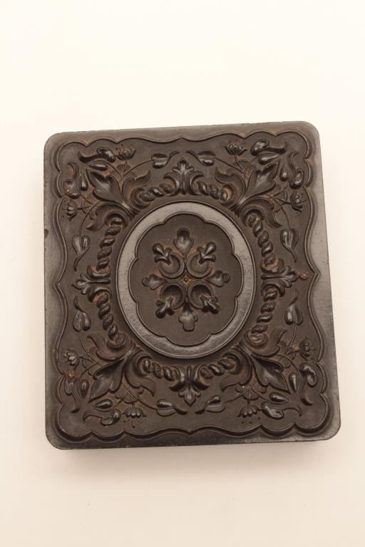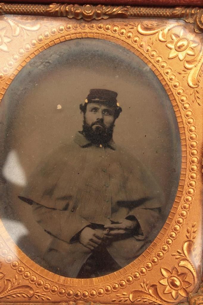 Tintype of soldier in kepi and wearing coat with cape. In floral gutta percha case. The image measures 2 ½” from top to bottom. The image is good with normal aging. Case very good plus to almost fine. Est.: $150-$300