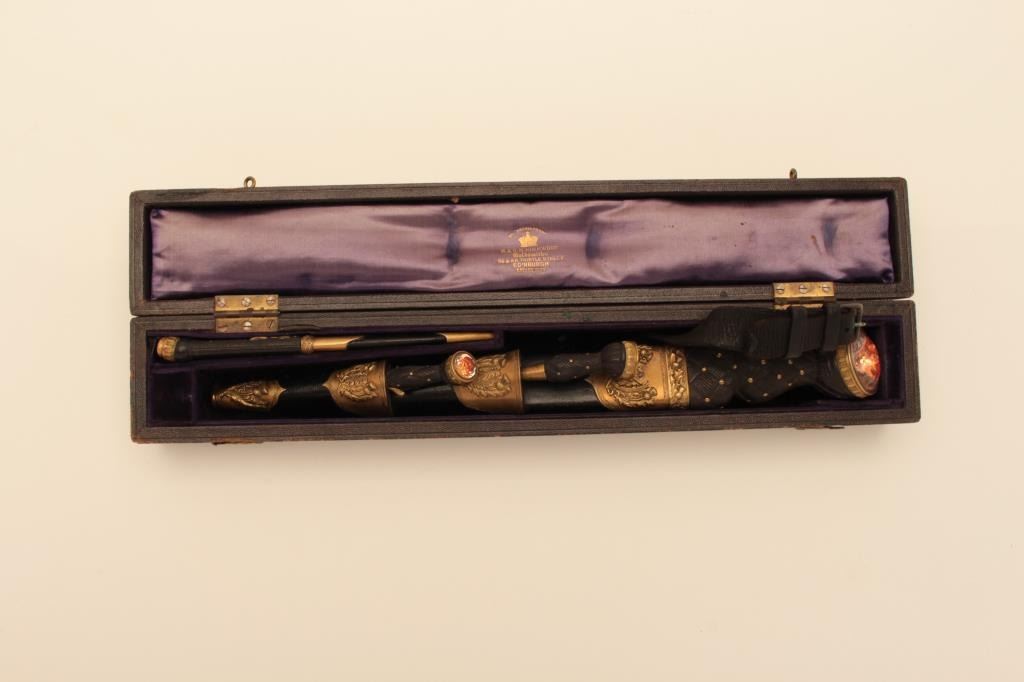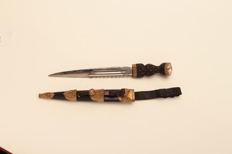 Scottish Regimental Dagger for 42nd highlanders A.K.A. The “Blackwatch” cased with matching stocking dagger. Makers label gold embossed in lid “By Appt-Crown Logo-R&H Kirkwood, Goldsmiths, 86&88 Thistle St.,Edinburgh, Est. 1833”. The dagger measures 16” overall with a 10 1/8” blade showing etched motto and in excellent condition. Fancy brass mounts and orange gem stones. Matching trousse set. Matching Kirkwoodstamped stocking dagger with St. Andrews on cross inlay and gem stone in hilt. The velvet and satin lined case is covered in Moroccan leather and near fine. Est.: $2000-$4000